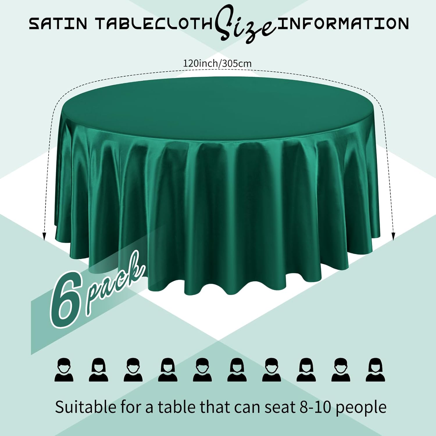 - Package List: You will get 6 packs dark green satin tablecloth.The size of satin table covers are 120 inch/305 cm, which is large enough to decorate a table that can accommodate 10-12 persons.The tablecloth size is usually larger than your table size. Please measure your table size before buying.