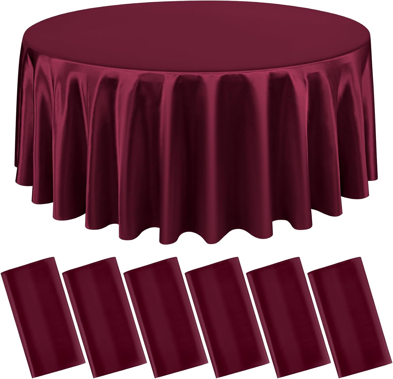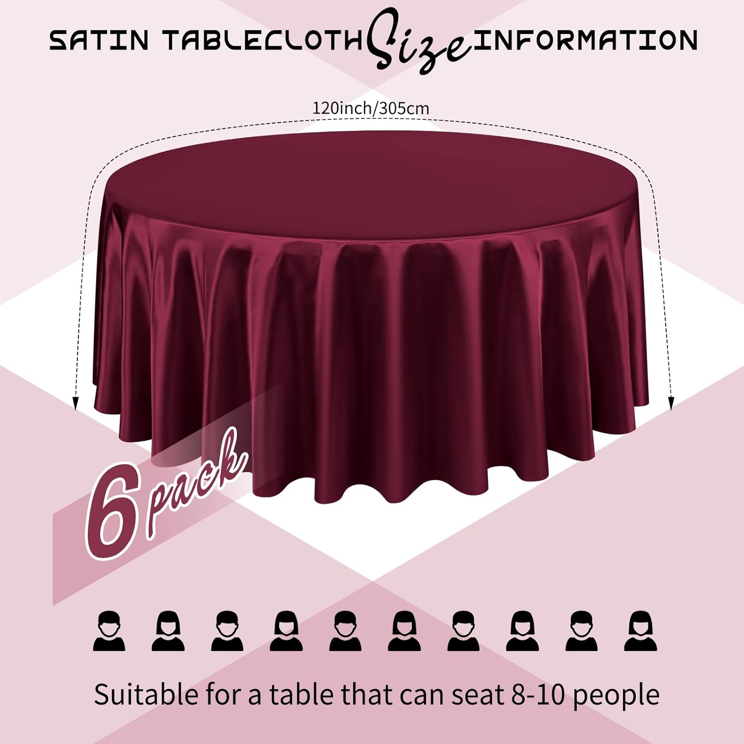 - Package List: You will get 6 packs burgundy satin tablecloth.The size of satin table covers are 120 inch/305 cm, which is large enough to decorate a table that can accommodate 10-12 persons.The tablecloth size is usually larger than your table size. Please measure your table size before buying.