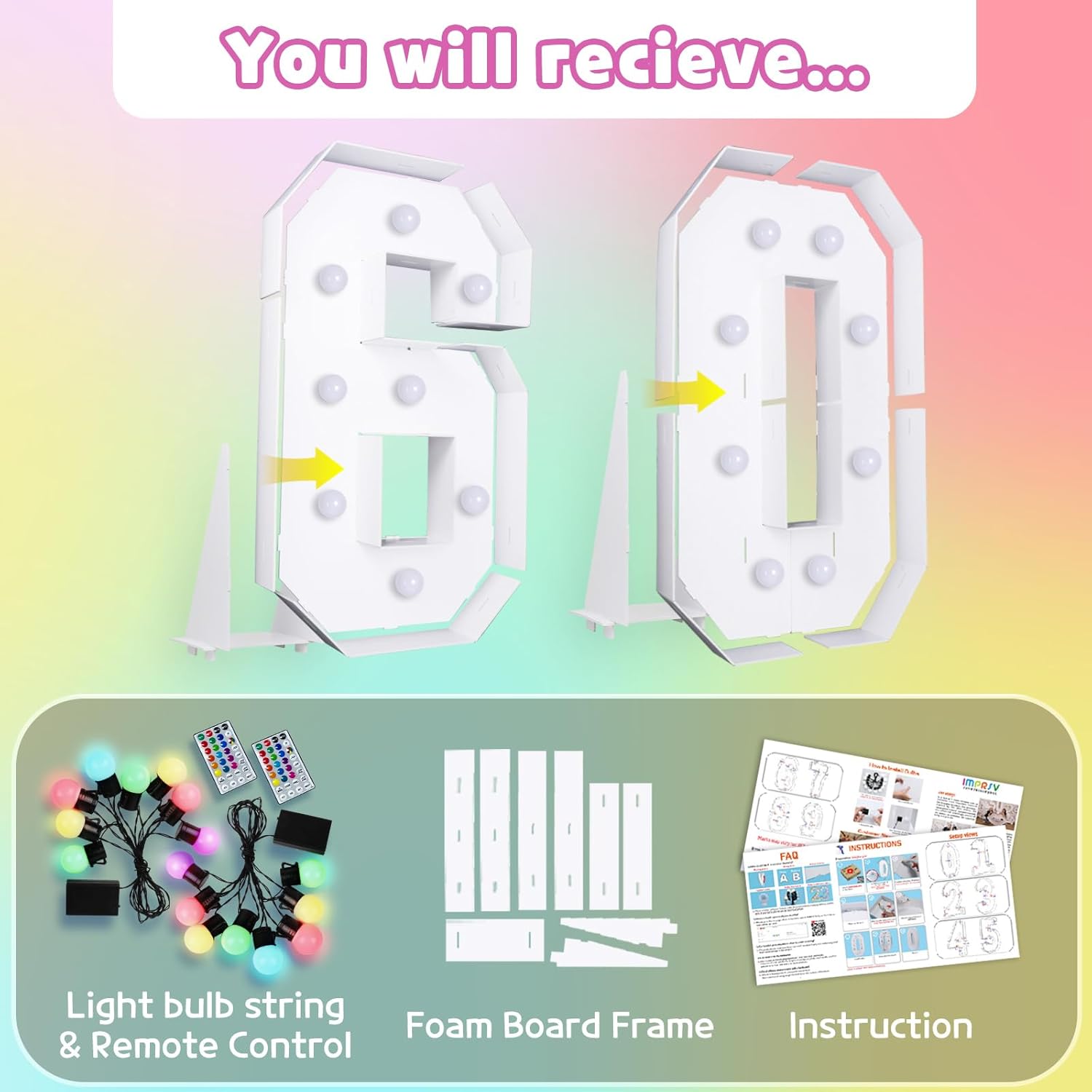 Marquee Numbers 60th-Birthday Decoration: Colorful 3FT Large Light Up 60 Year Old Birthday Decorations Anniversary Backdrop for Boys Girls Cardboard Sign 18 Colors Number 60 Mosaic Balloon Frame