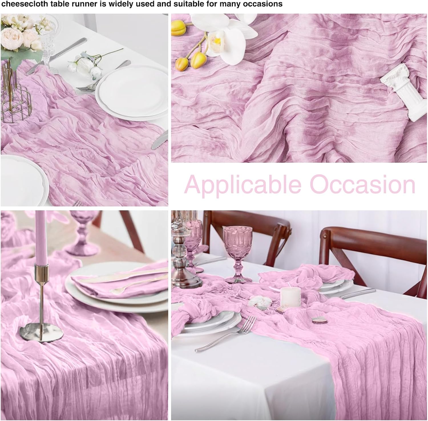- 【Widely Occasion】: Cheese cloth light pink sheer table runner looks nice on various occasions, such as wedding, baby shower, bridal showers, birthday parties, theme party, engagement banquet, candy buffets, the top of the piano, fireplace, dessert tables, weddings arch, Valentine's Day, Thanksgiving, Christmas and other special occasions. The pretty table runner well decorates home, hotel, wedding, parties, grand estates and gardens and more, that makes your life chic.