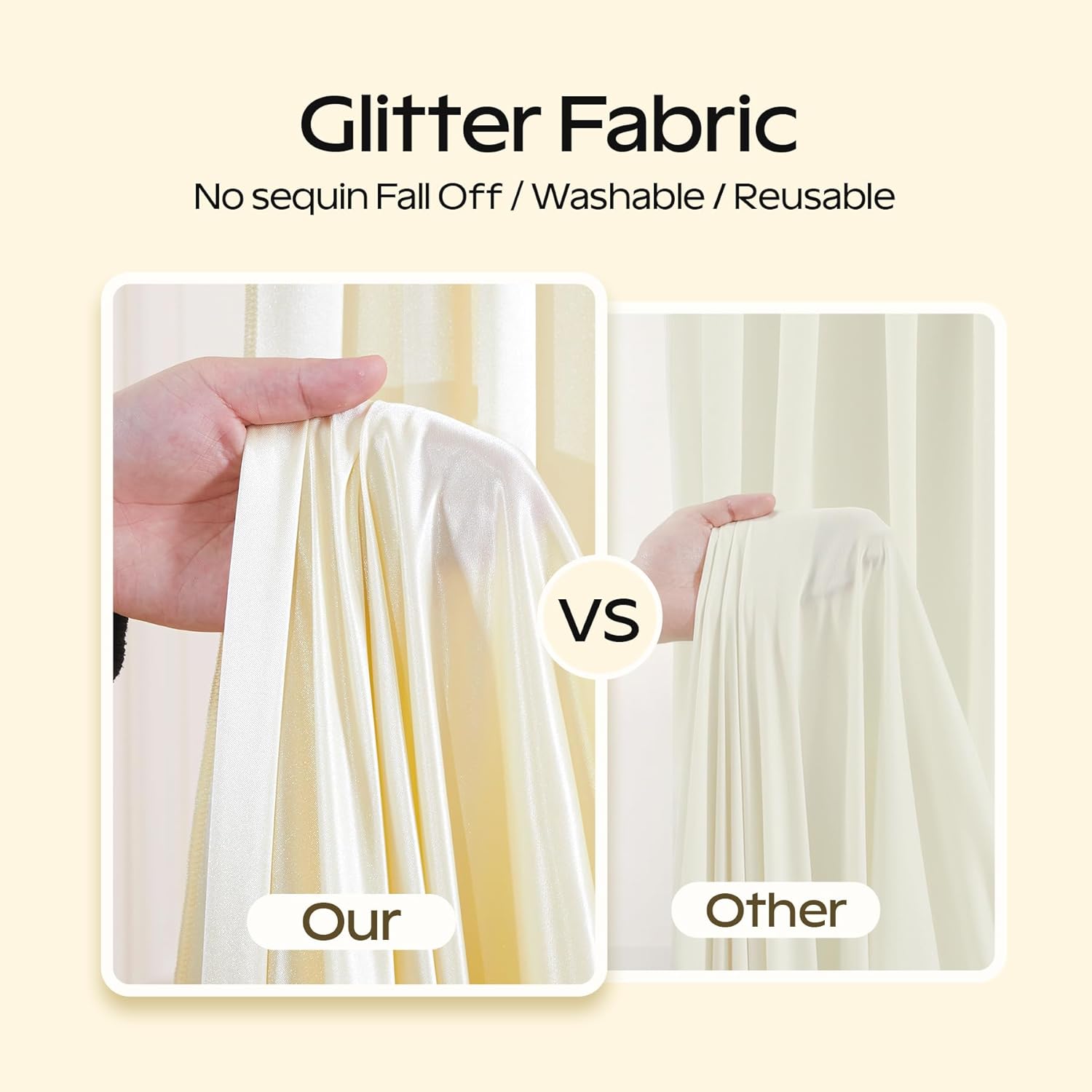 - Glitter & Soft & Durable Champagne Glitter Backdrop Curtain:Our champagne shimmer backdrop curtain unlike ordinary sequin backdrops,our glitter backdrop is soft,thick, durable and glitter that doesnโt shed.The backdrop curtain have two smooth polyester base combined with glitter that catches the light beautifully.Whether use it as a backdrop or a prop draped around a subject or a parties,it can creating a magical, high-end feel and adds a unique sparkle.
