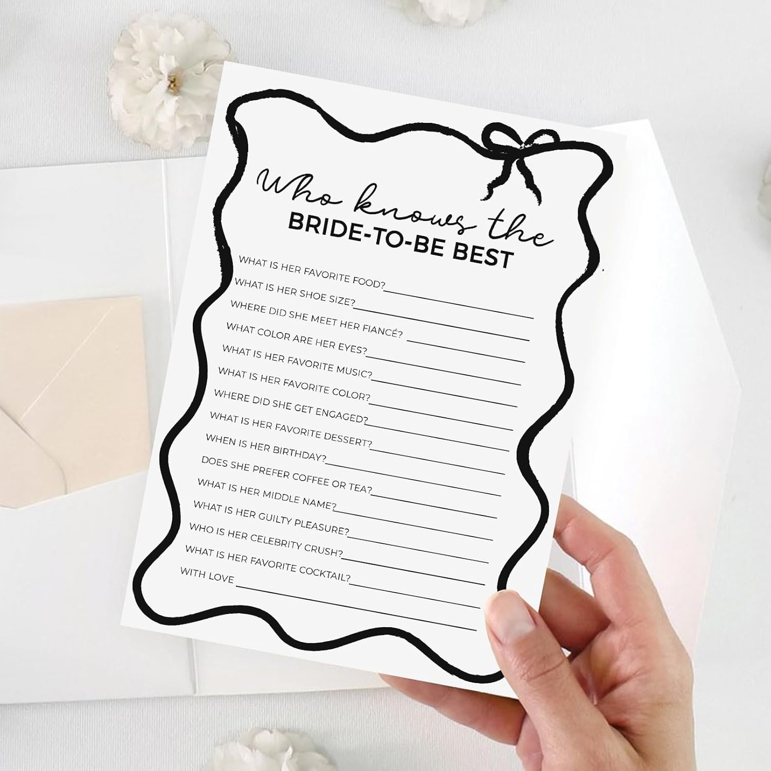 - ON-TREND DESIGN – These bridal shower games cards feature a stylish hand-drawn wavy border and a dainty bow accent, capturing the latest aesthetic trends.