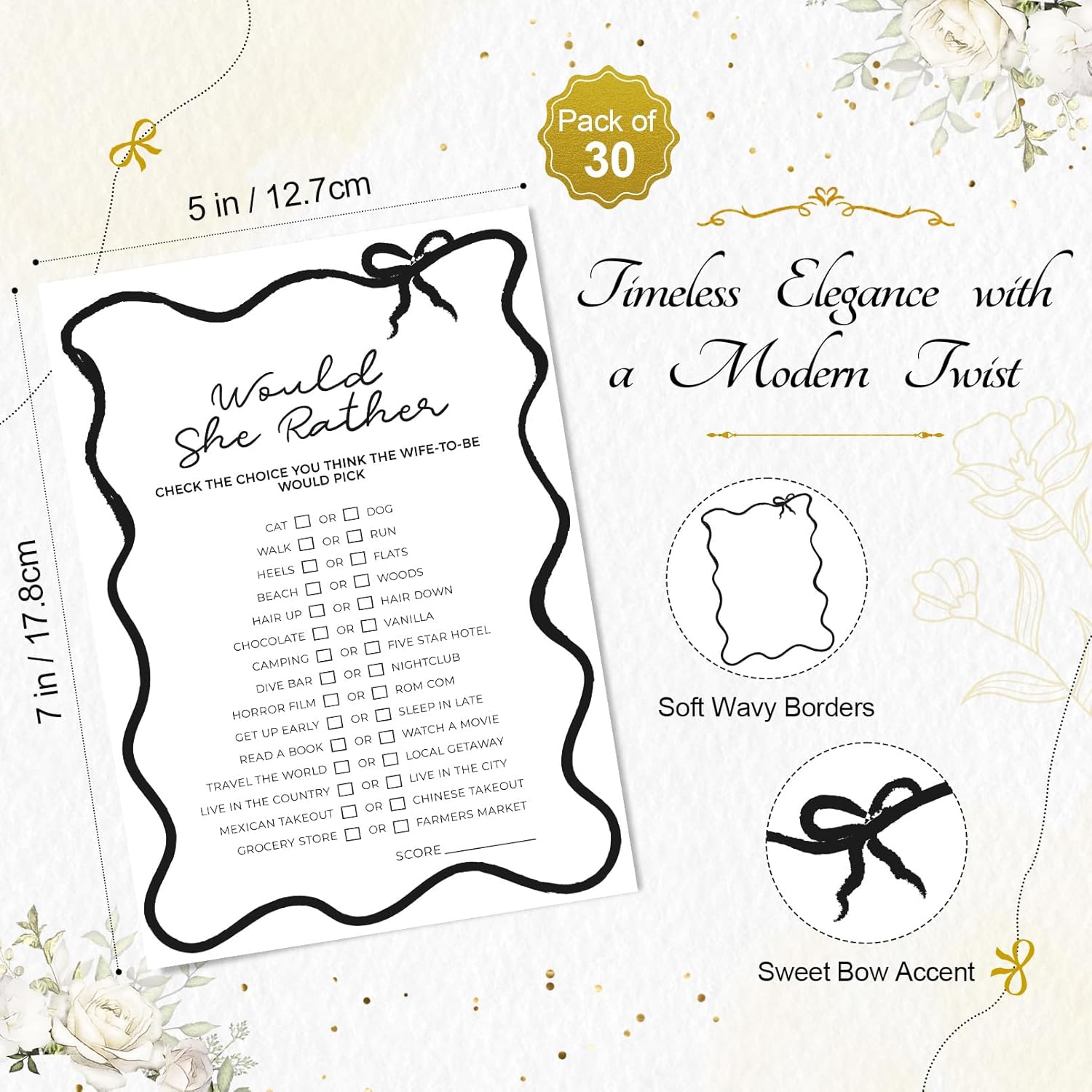 - ON-TREND DESIGN – These bridal shower games cards feature a stylish hand-drawn wavy border and a dainty bow accent, capturing the latest aesthetic trends.