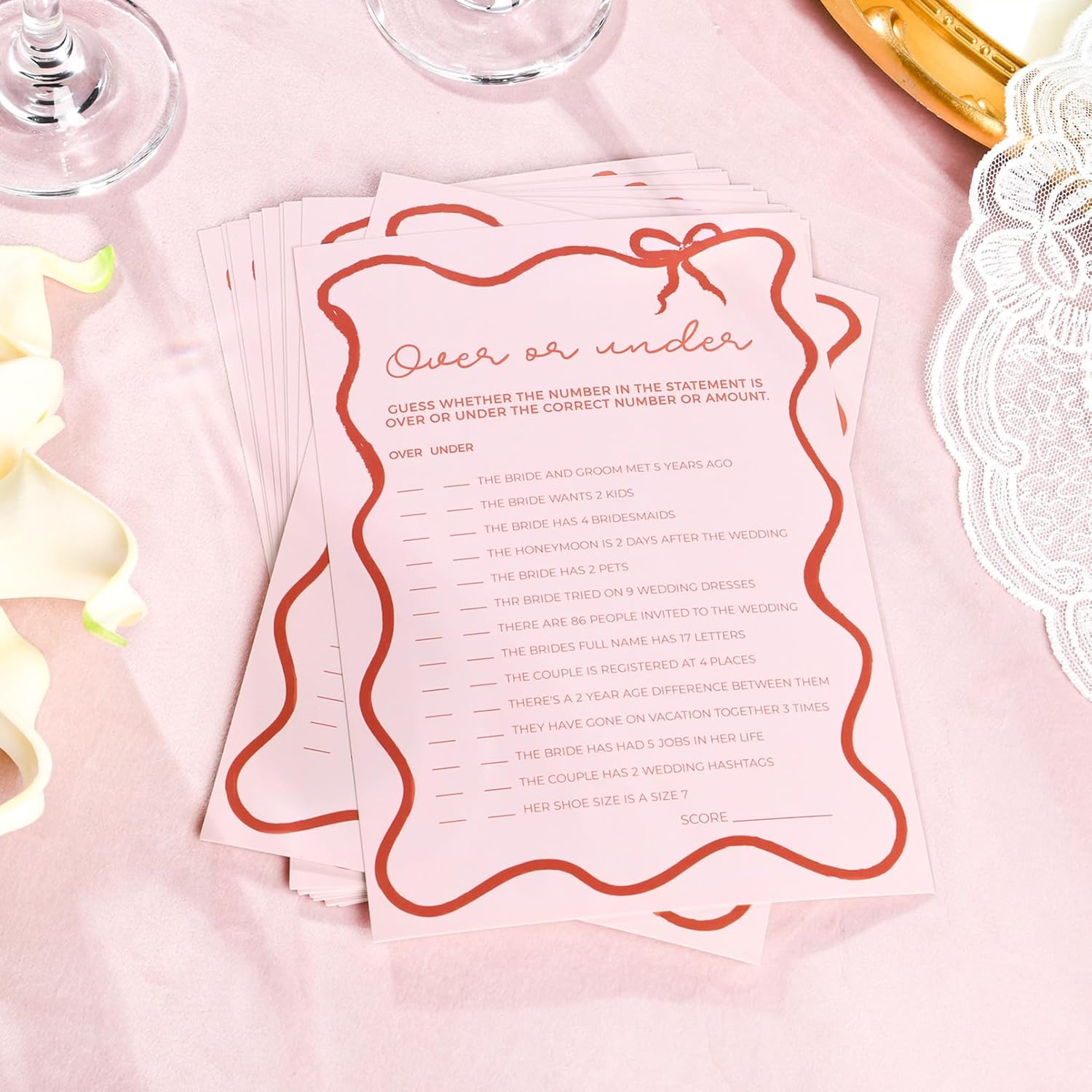 DEEKA 30 PCS Bridal Shower Games Card for 30 Guests Pink Wavy Border Ribbon Bow Funny Wedding Bachelorette Party Games for Reception (Over Or Under)