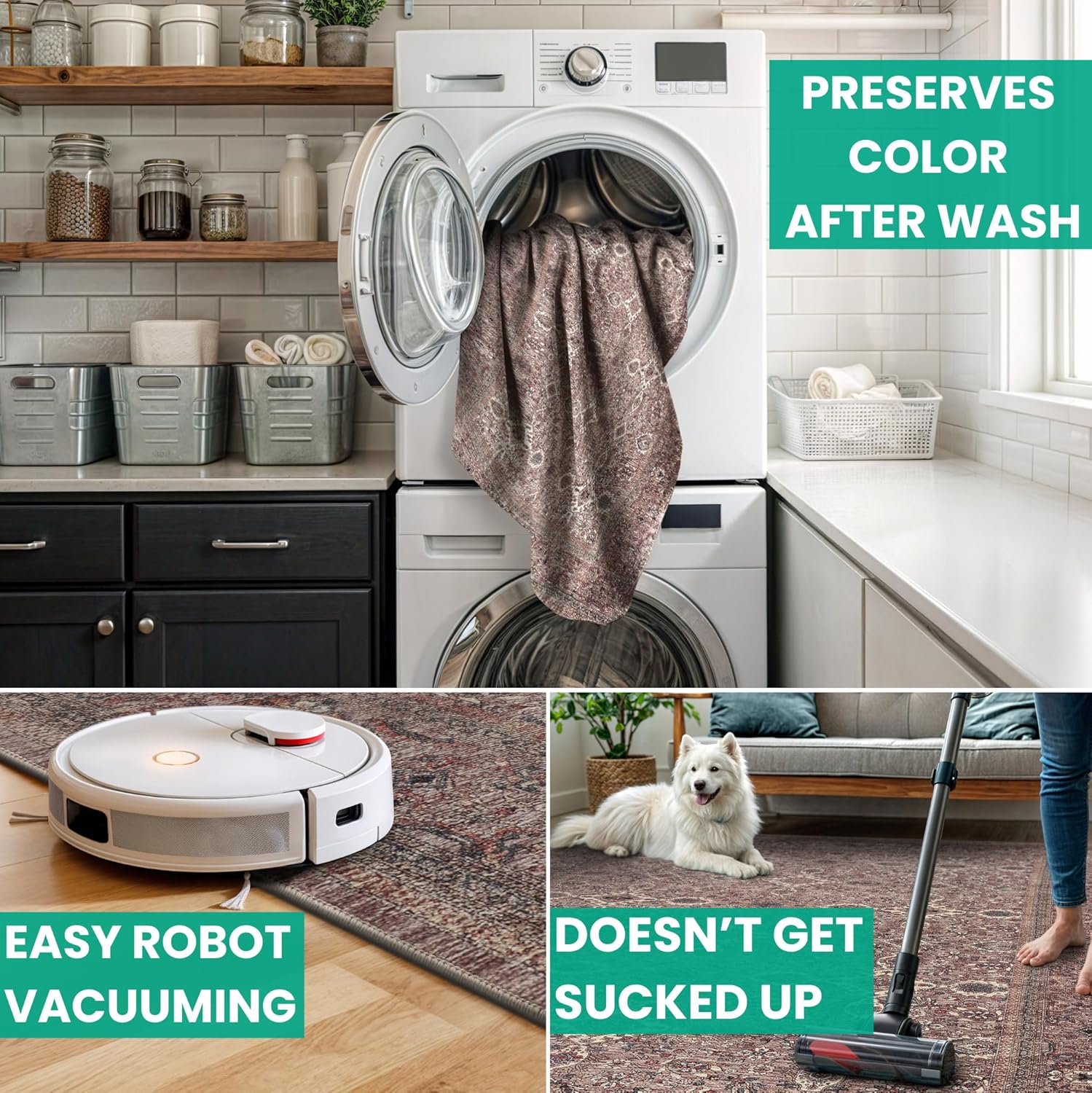 - MACHINE WASHABLE: Machine wash on delicate cycle (do not use bleach) at 85°F (30°C) and line dry or dry on air-only cycle without heat. Vacuum regularly and spot clean small stains. This easy to clean rug is perfect for families with kids and pets, and for high traffic areas.