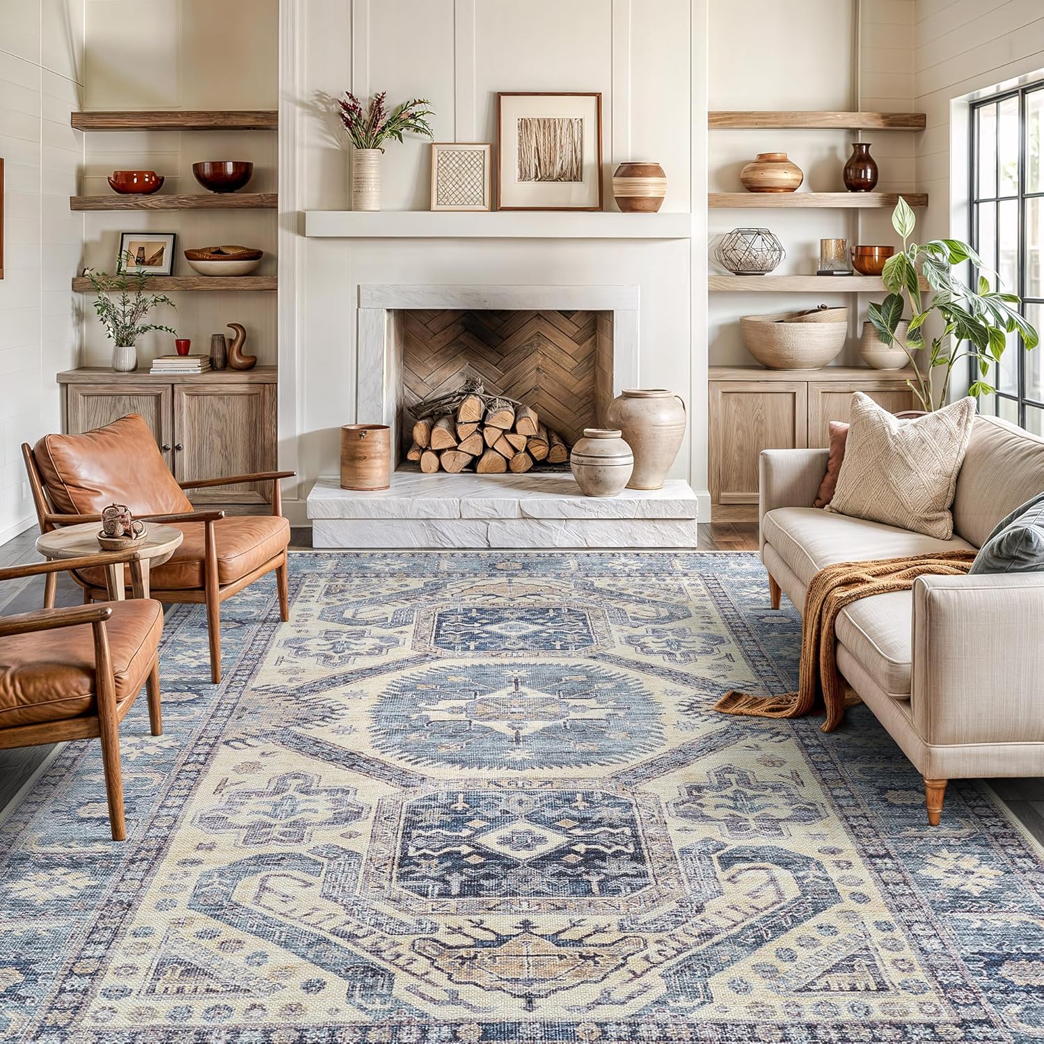 Bloom Rugs Washable Non-Slip 9' x 12' Rug - Blue/Beige Traditional Oriental Area Rug for Living Room, Bedroom, Dining Room, and Kitchen - Exact Size: 9' x 12'