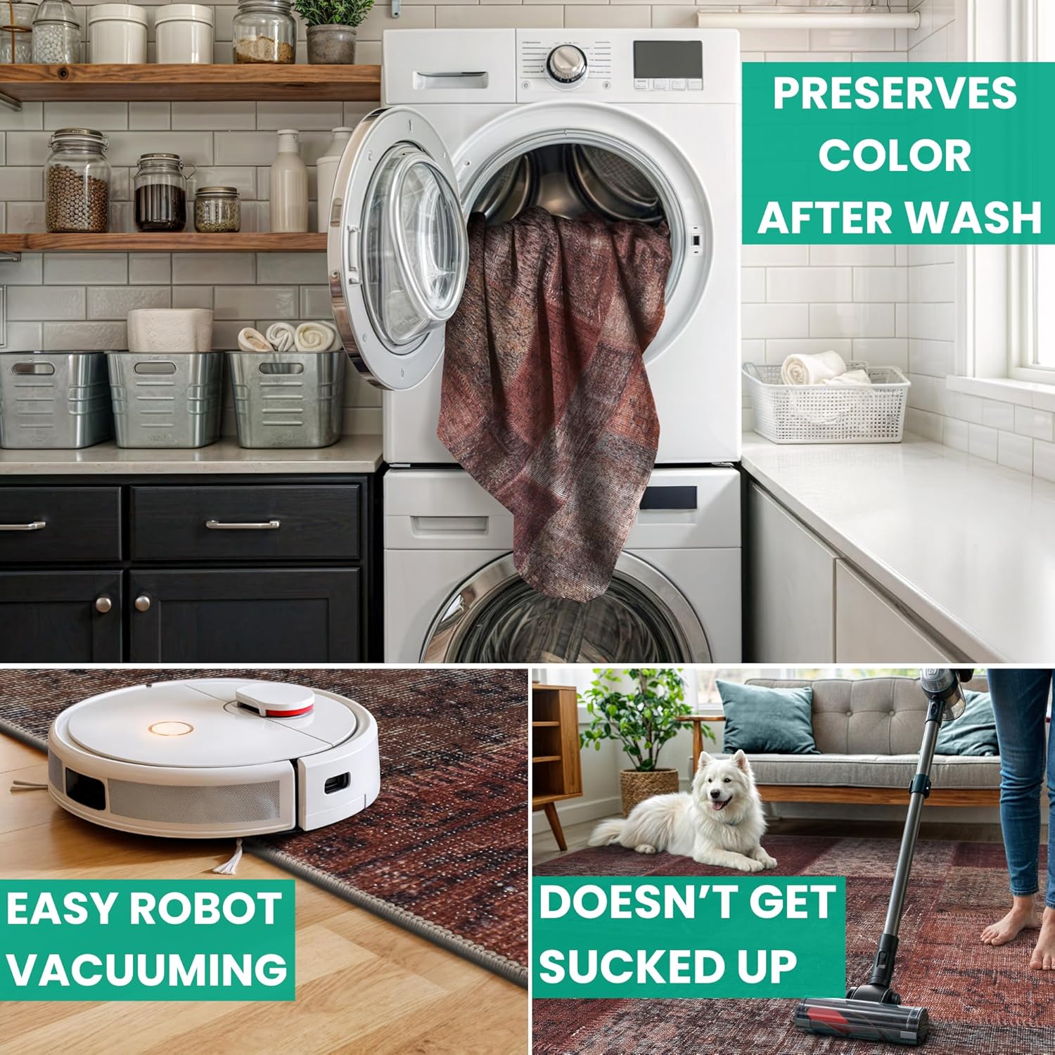 - MACHINE WASHABLE: Machine wash on delicate cycle (do not use bleach) at 85°F (30°C) and line dry or dry on air-only cycle without heat. Vacuum regularly and spot clean small stains. This easy to clean rug is perfect for families with kids and pets, and for high traffic areas.