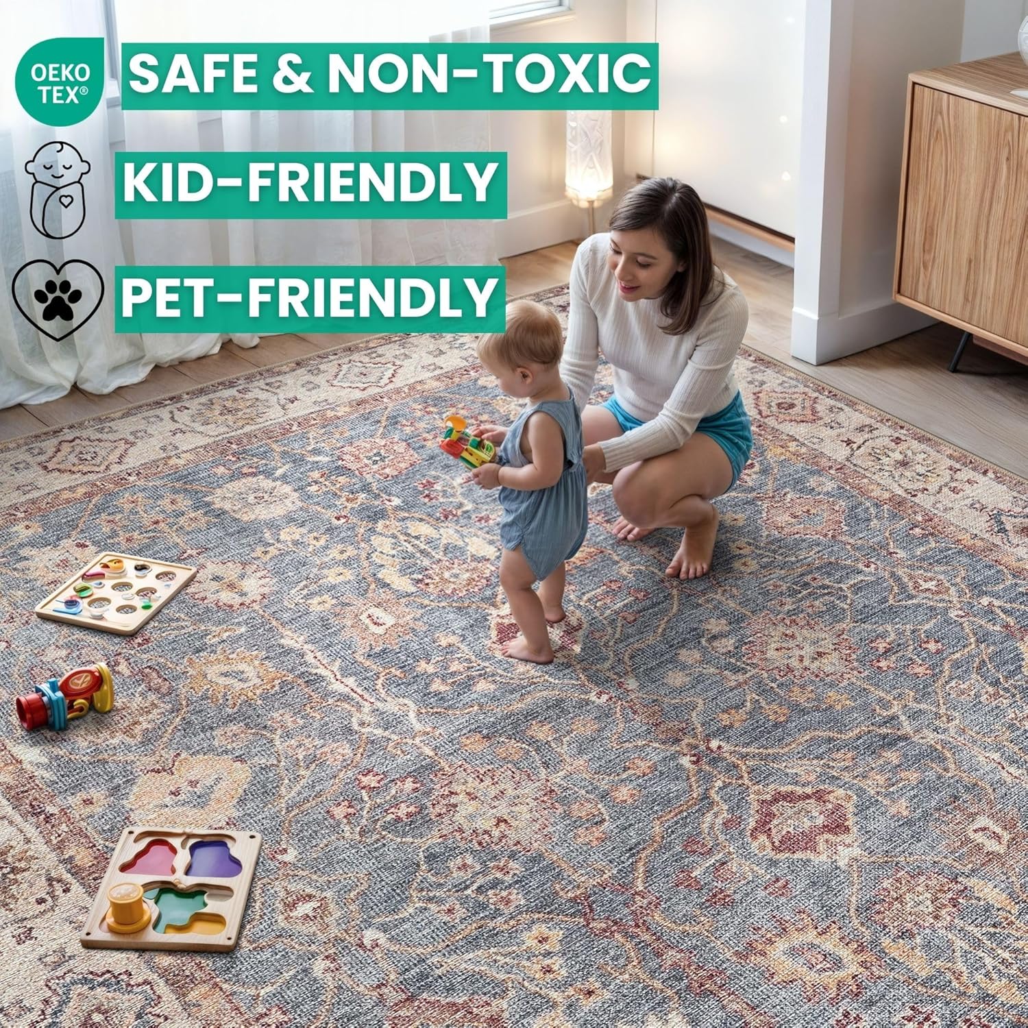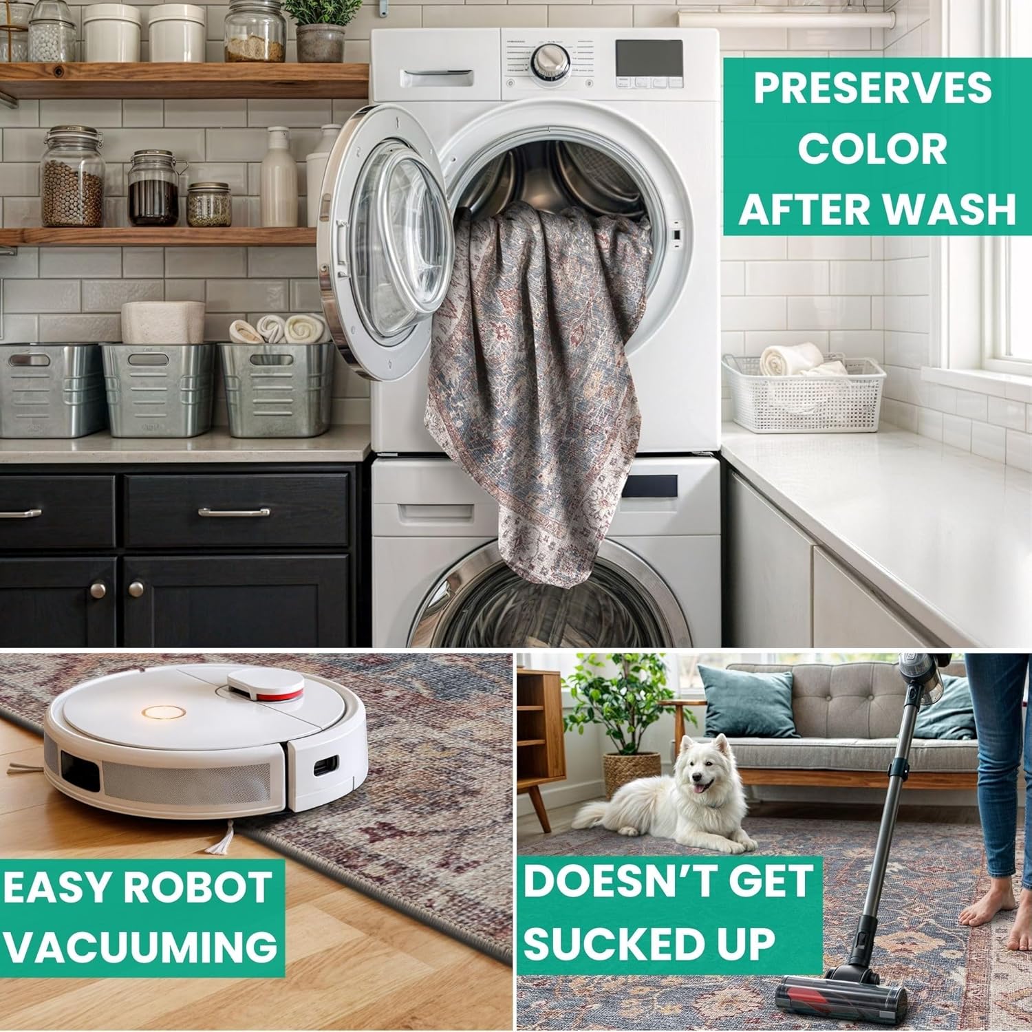 - MACHINE WASHABLE: Machine wash on delicate cycle (do not use bleach) at 85°F (30°C) and line dry or dry on air-only cycle without heat. Vacuum regularly and spot clean small stains. This easy to clean rug is perfect for families with kids and pets, and for high traffic areas.