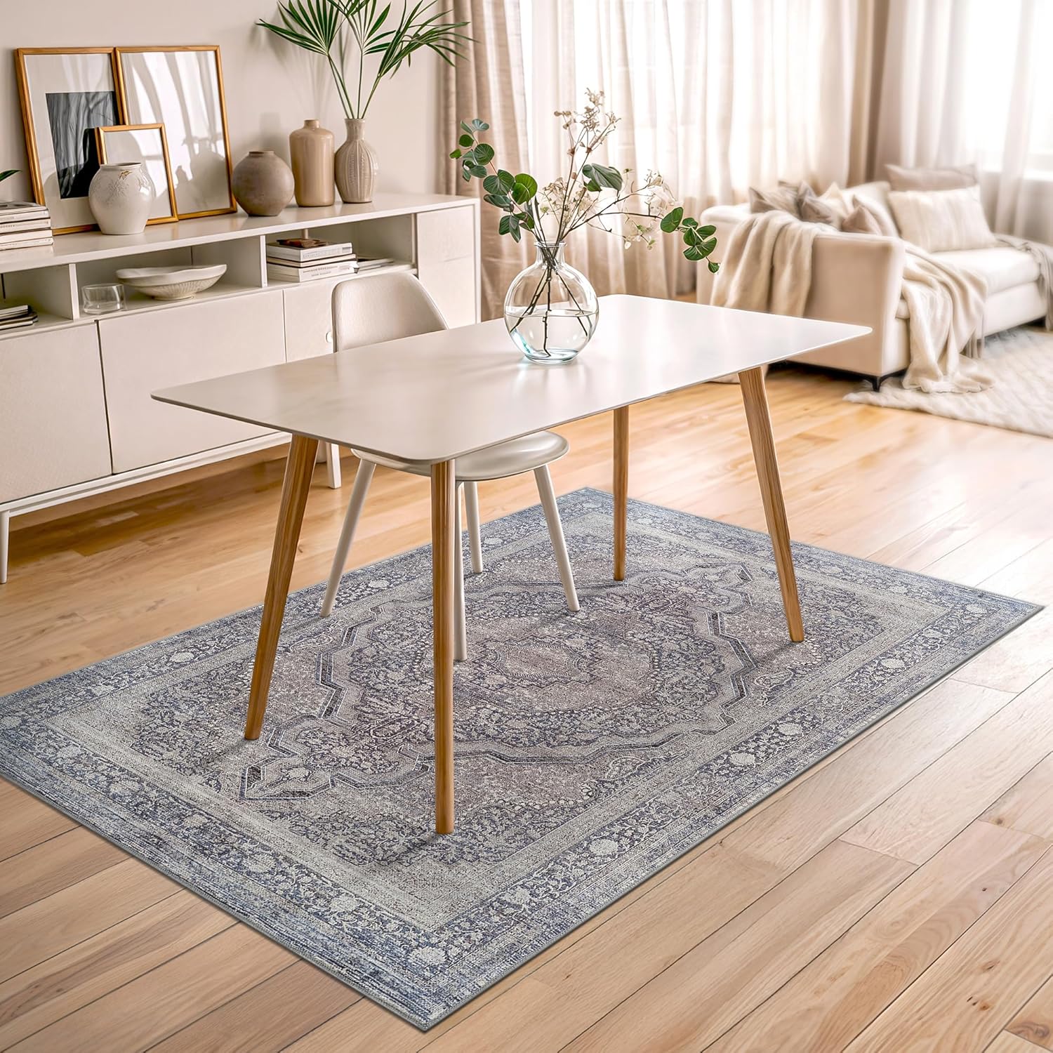 Bloom Rugs Washable Non-Slip 4' x 6' Rug - Blue/Steel Gray/Beige Traditional Medallion Area Rug for Living Room, Bedroom, Dining Room, and Kitchen - Exact Size: 4' x 6'