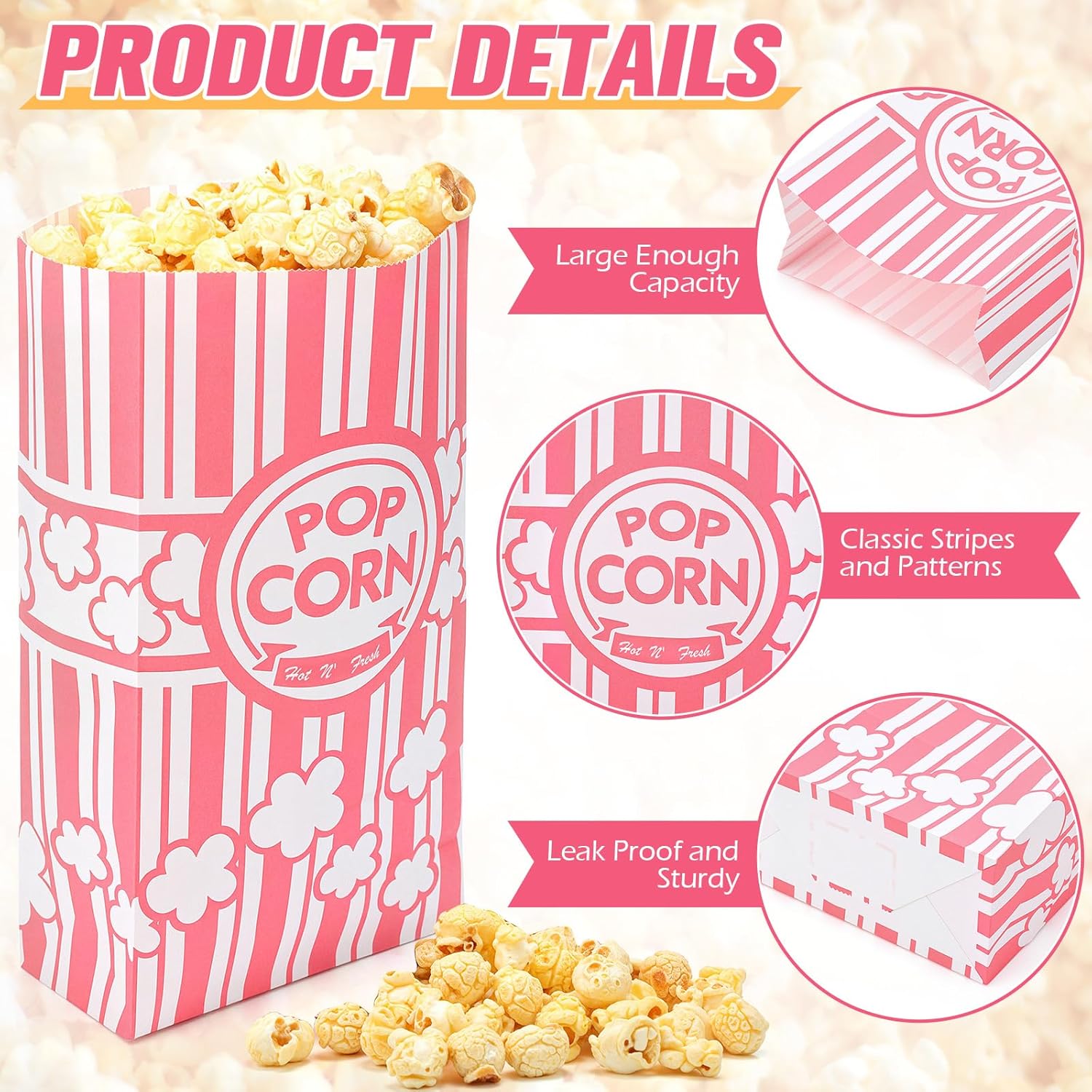 - Vintage and Resonant Appearances: the individual popcorn containers adopt classic pink and white striped patterns and delicious popcorn patterns, which can arouse your childhood memories at first sight, creating a vintage and nostalgic atmosphere