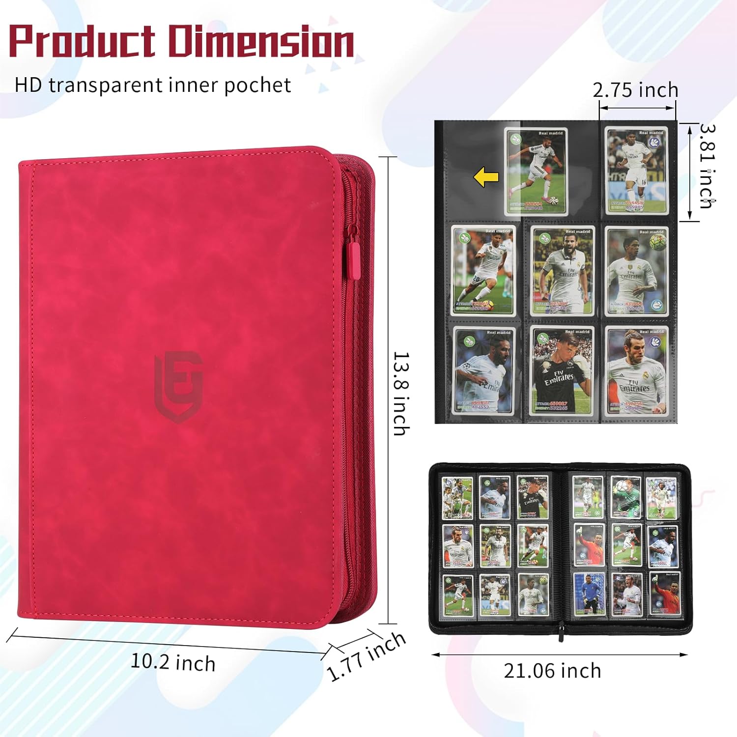 - DETAILED DESIGN:The card binder is made of premium PU leather, water or raindrops will not penetrate, different colors of the trading card binder with different colors of the zip, to meet your personalised needs. Side card pocket prevents cards from spilling out and protects your cards from fading and staining
