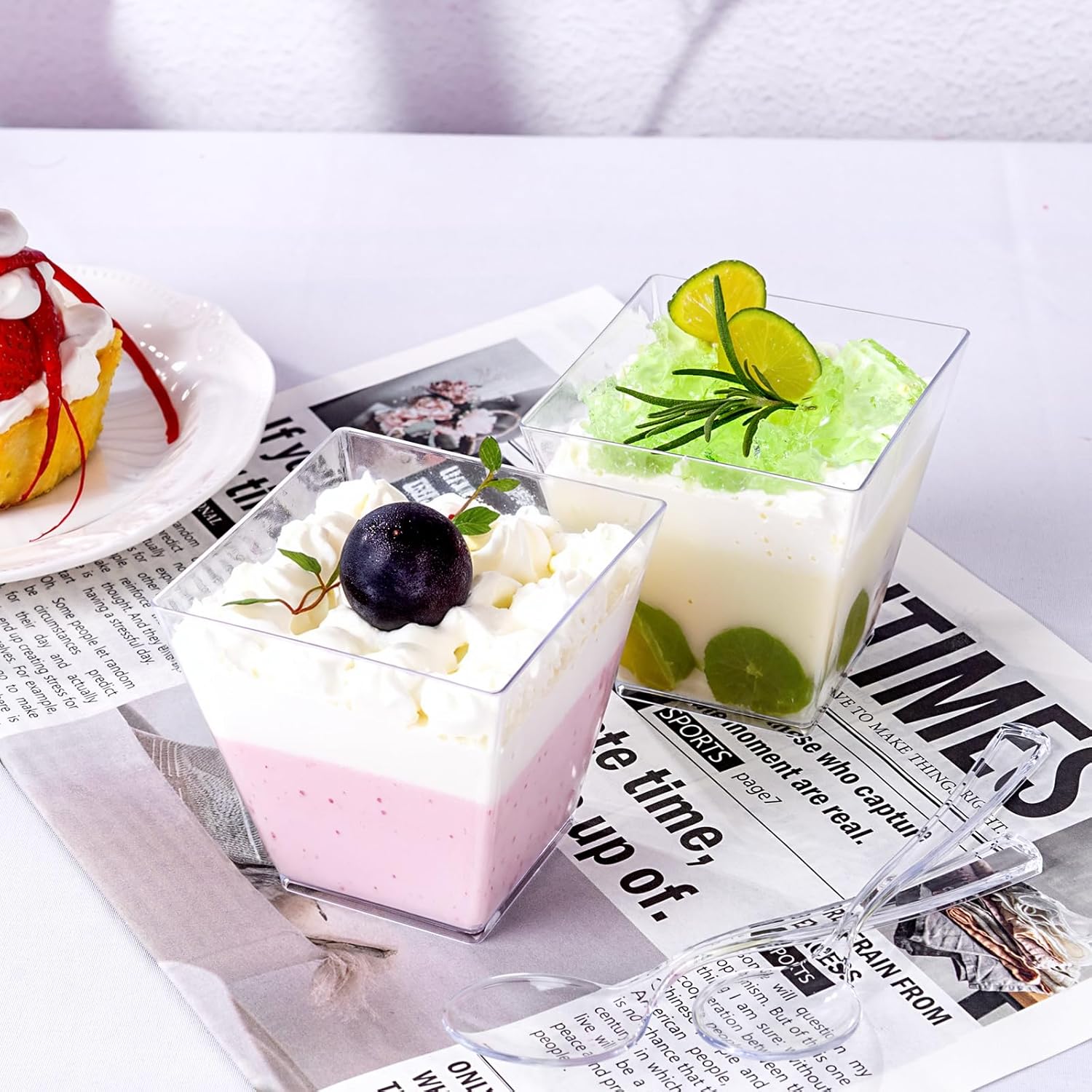 - Dessert Cups Set - Elevate your displays with 51 clear square plastic cups and 51 clear plastic tasting spoons. The 8oz mini dessert cups offer generous layering space for parfaits or trifles while maintaining sleek proportions ideal for catering buffets