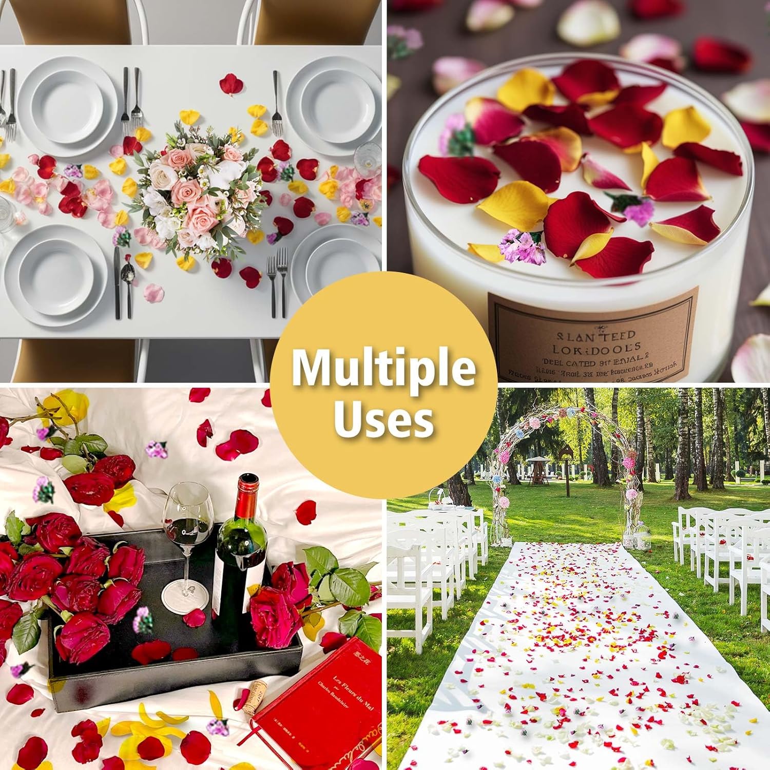- Rose Petals Deocr: Rose petals in bulk are ideal decorations for wedding decor, theme party, romantic nights, proposal dinner, candlelight dinner, church aisle, baby shower, candy buffet, special festival decorations. Flower petals are ideal for wedding, surprise proposal, Valentine’s Day, celebration, honeymoon, anniversary and Christmas gifts for women. They can also be used to create DIY creative floral arrangements
