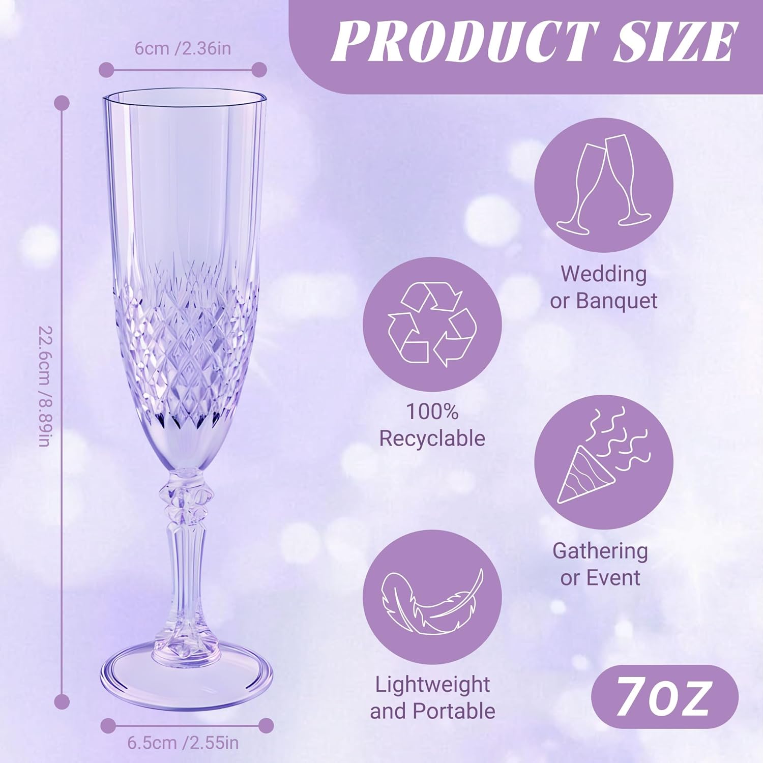 - Charming Set: Champagne flutes set include 48 retro-style light purple champagne plastic wine glasses, providing ample quantity to meet your daily use and replacement needs. A suitable champagne cup is the icing on the cake. Plastic wine glasses not only carry the wine, but also carries the laughter and blessings