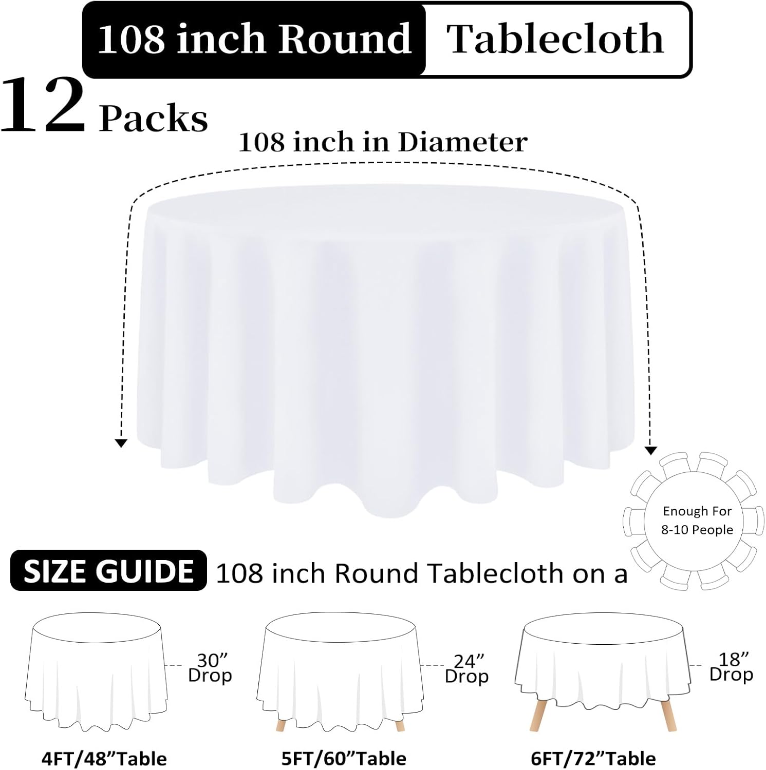 - Measurements and Colors: This white cloth tablecloths is 108 inches in diameter, perfect for standard 6FT(72") round tables, providing a 18" drop, or 24" if your round table is 5FT (60"). This table cloth round cover is available in totally 5 colors. Youโll be able to choose a luxurious and ideal table cover for your table. Please measure the size of your table before purchasing.