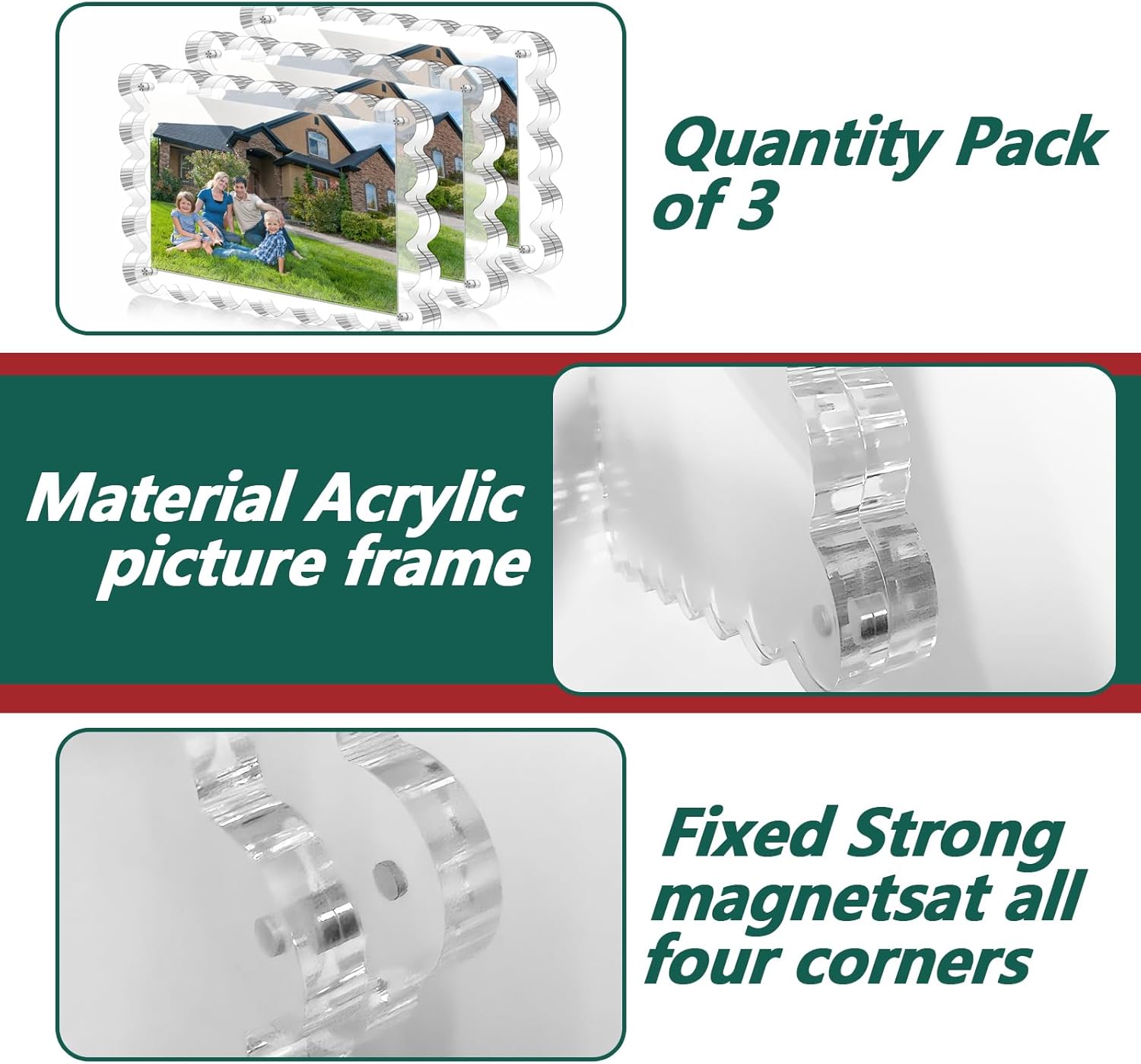 3 Pack Magnetic Acrylic Picture Frames 5x7 Inch - Freestanding Scalloped Magnet Photo Frame with 10+10MM Thick Block, Double Sided Clear Frameless Frame for Desktop Display