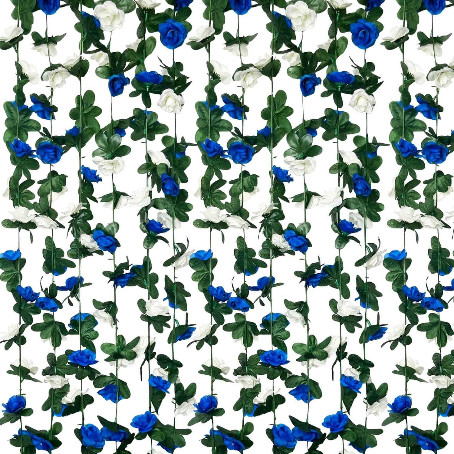 8Pcs 63Ft Royal Blue&White Fake Rose Hanging Flowers, Artificial Flower Vine, Hanging Floral Vine Garland for Wedding, Wall Arch, Halloween, Christmas Garden Backdrop Decor
