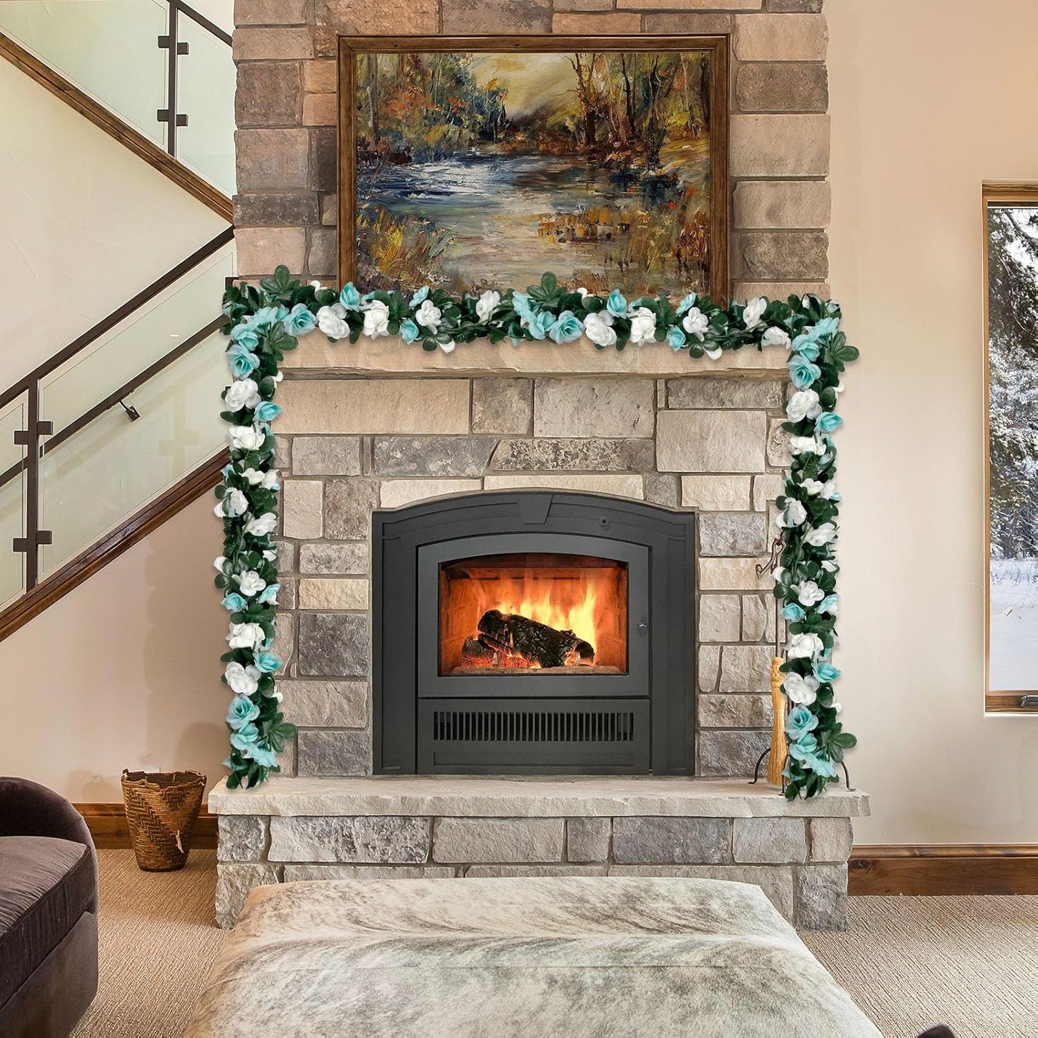 8Pcs 63Ft Teal&White Rose Garland, Fake Rose Hanging Flowers, Artificial Flower Vine, Hanging Floral Vine Garland for Wedding, Birthday Party, Wall Arch, Halloween, Christmas Garden Backdrop Decor