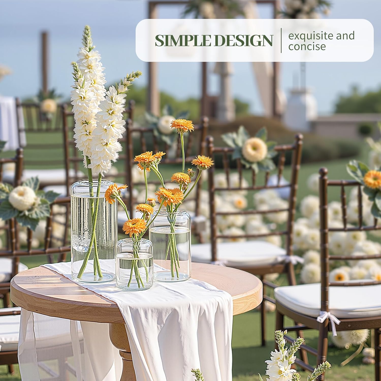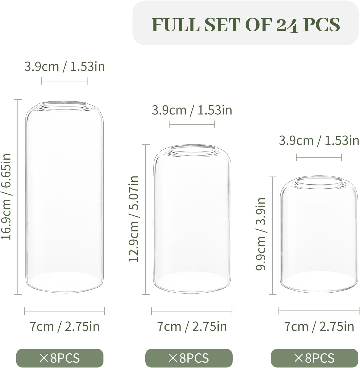 - 【24-Piece Versatile Flower Vase Set – 3 Elegant Sizes】Enjoy endless decorating possibilities with this set of 24 clear glass bud vases (flowers not included). The set includes three modern vase heights – 3.9", 4.9", and 6.7" – each with a uniform 2.75" diameter and a narrow 1.6" opening. Perfect for creative floral arrangements, wedding decor, or home accents.