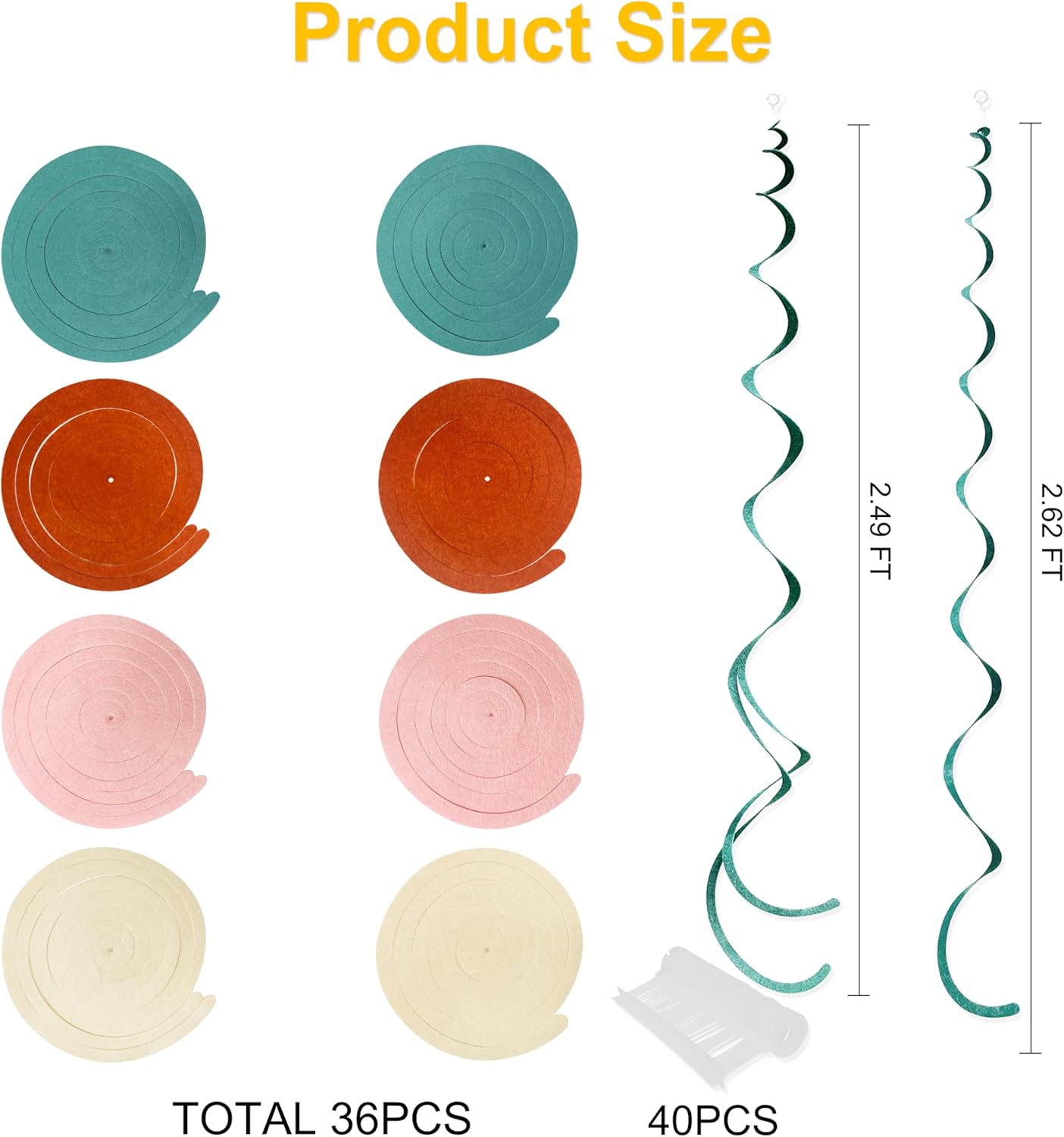 36 Pcs Boho Hanging Swirl Decorations Aqua Green Orange Pink Beige Felt Swirl Streamer Spiral Ceiling Garland for Birthday Engagement Baby Shower Wedding Bridal Shower Party Supplies Nursery Decor