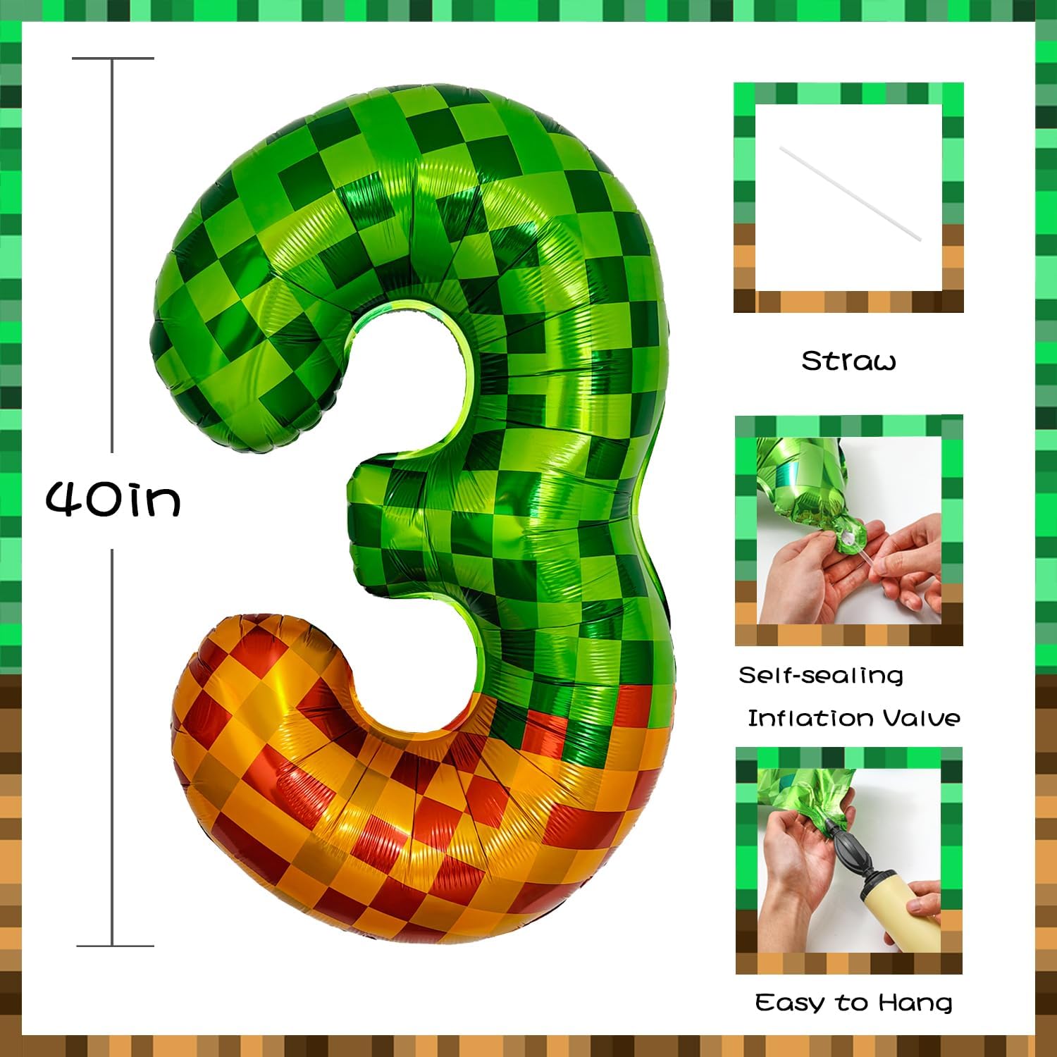 Pixel & TNT Theme 40in Giant Number Balloons - Foil Mylar Birthday Party Decorations for Kids Adults Cumpleaños, Block Style Pixel Art Shape Balloon Decor Supplies (Pixel, Number 3)