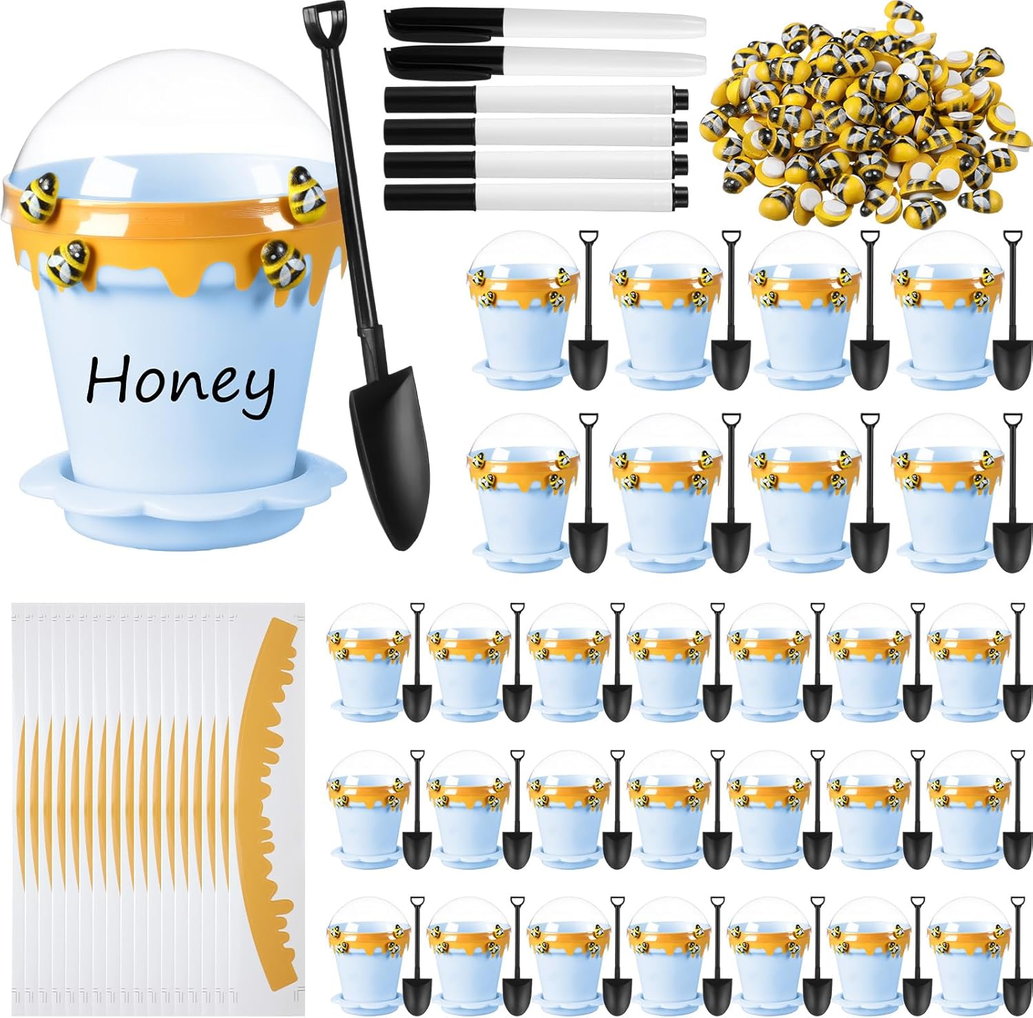 - Package Contains: includes 30 mini honey bee pots, 30 lids, 30 saucers, 30 shovel shaped spoon, 30 stickers, 120 wooden yellow bee decorations, 4 erasable markers, 2 indelible markers, ideal for DIY gifts, unleash your artistic talent to create a special and vibrant display, add fun to your bee party, birthday party, baby shower