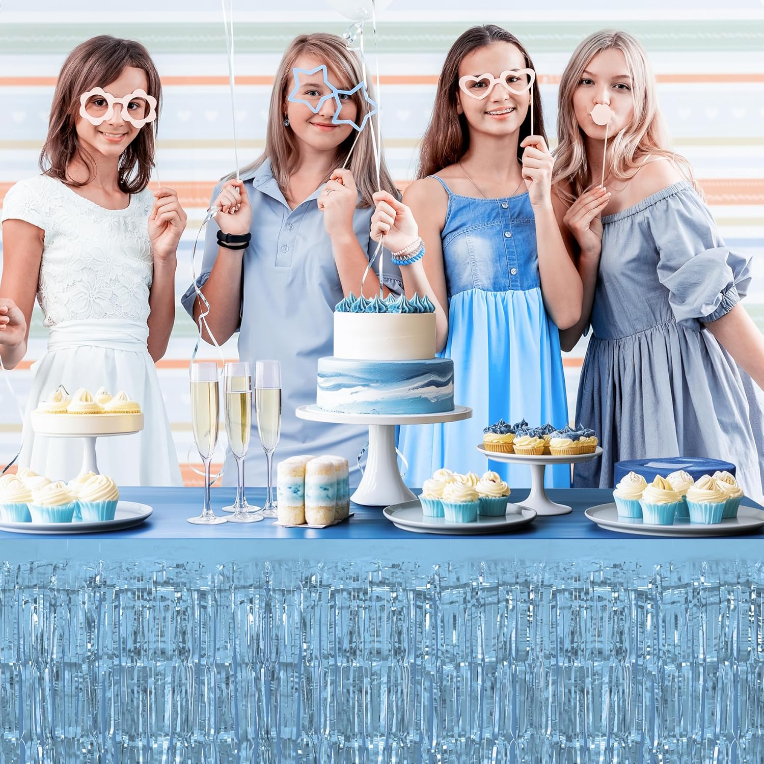 2 Pack Light Pink Light Blue Table Skirts, 29x108" Metallic Foil Tinsel Fringe Table Skirt for Rectangle Tables Streamer Curtains Backdrop, Party Decorations for Birthdays, Weddings, Holidays