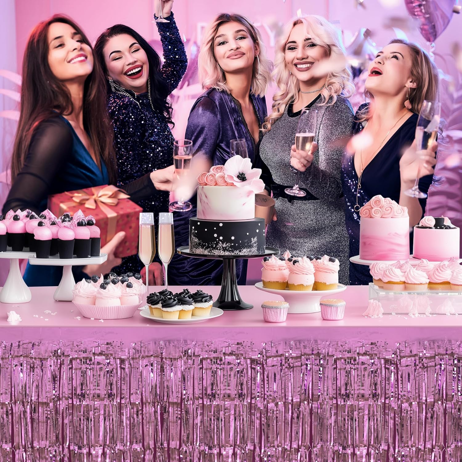 2 Pack Light Pink Green Table Skirts, 29x108" Metallic Foil Tinsel Fringe Table Skirt for Rectangle Tables Streamer Curtains Backdrop, Party Decorations for Birthdays, Weddings, Holidays