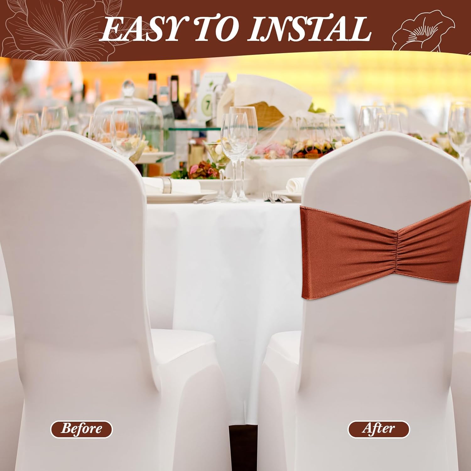 Moukeren 100 Pcs Spandex Chair Sashes Bows Bands Slider Sashes for Chair Covers Elastic Bands Ties Ribbon Decorations for Wedding Party Events Ceremony Birthday Banquet(Terracotta)