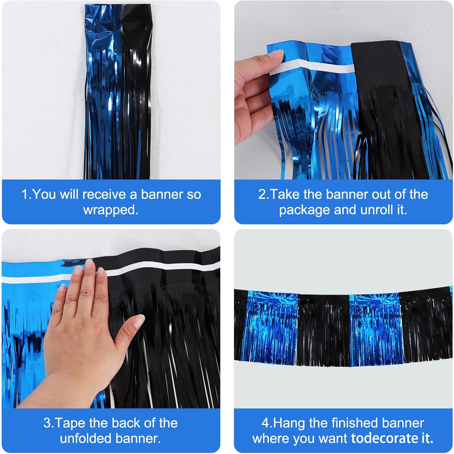 BEISHIDA 3 Packs Metallic Foil Fringe Garland Black Blue Wall Hanging Tinsel Fringe Banners for Car Floats Bridal Shower Wedding Birthday Easter Graduation Holiday Party Decoration(30 Feet)