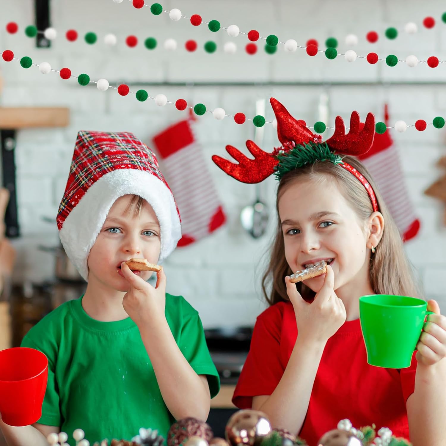 3 Pack Pom Pom Garland Colorful Felt Ball Garland Decorations, 6.5 Feet Long with 30 Balls Banner Hanging Supplies for Christmas, Parties (Red, Green & White)