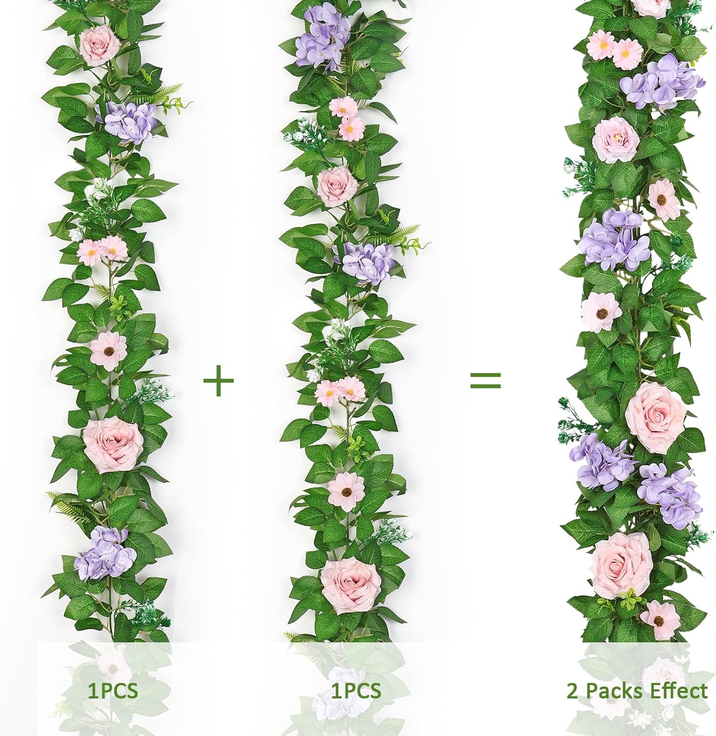 - 【Match with Rich Leaves and Flowers】Our greenery garland has approximately over 40 branches with dense leaves , giving your space a vibrant and lively feeling. Each consists of 3 kinds of silk leaves in different size and species. Each floral garland contains 6 different types of flowers, including roses, baby daisies, hydrangeas and more. The flowers are skillfully arranged, full and highly ornamental.Floral garland adds a lively and dazzling spring touch to your home decorations.