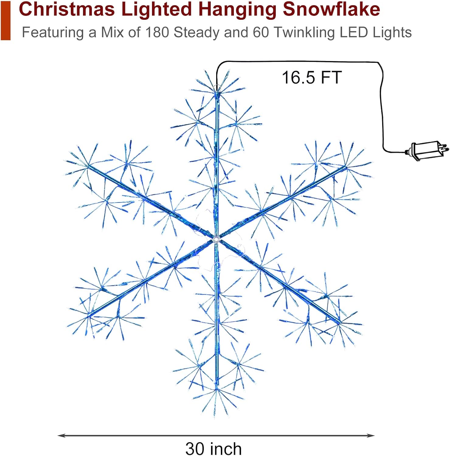 - Dimension: Upgrade your holiday decor with BAYN Hanging Snowflake Lighted Branches! 30 inches diameter is perfect for adding a mystical look to your space over the Christmas season. 16.5 ft extension wire allows for easy connection to socket