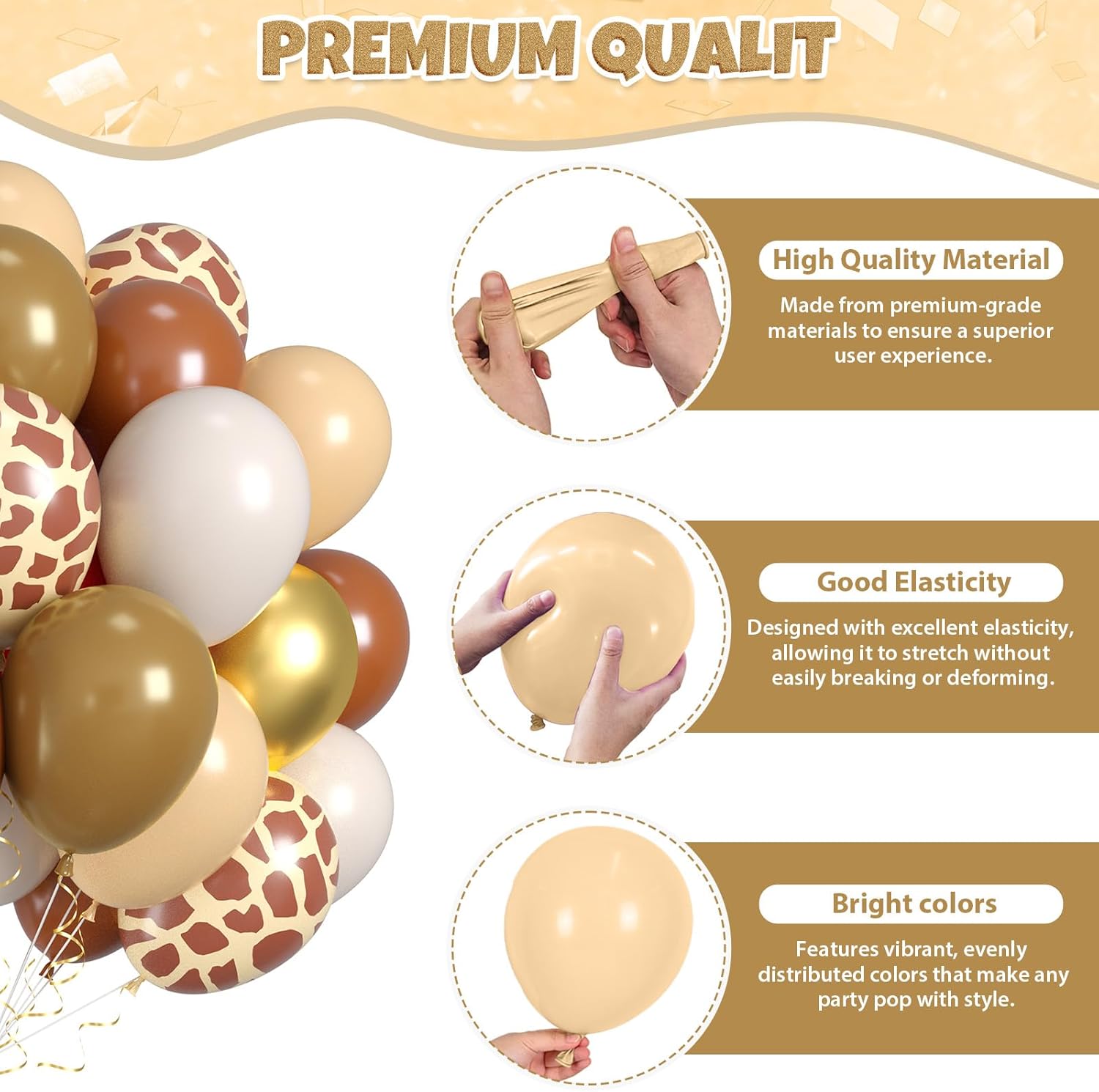 - All-in-One Set: This brown gold balloons kit includes 12pcs retro sand white balloons, 10pcs retro nude balloons, 8pcs metallic gold balloons, 12pcs coffee brown balloons, 10pcs light brown balloons, 8pcs giraffe print balloons, and 1pc gold ribbon. Whether it’s a birthday bash, wedding, or bridal shower, the thoughtful color combo, suitable for adding a fun, modern touch to any celebration.