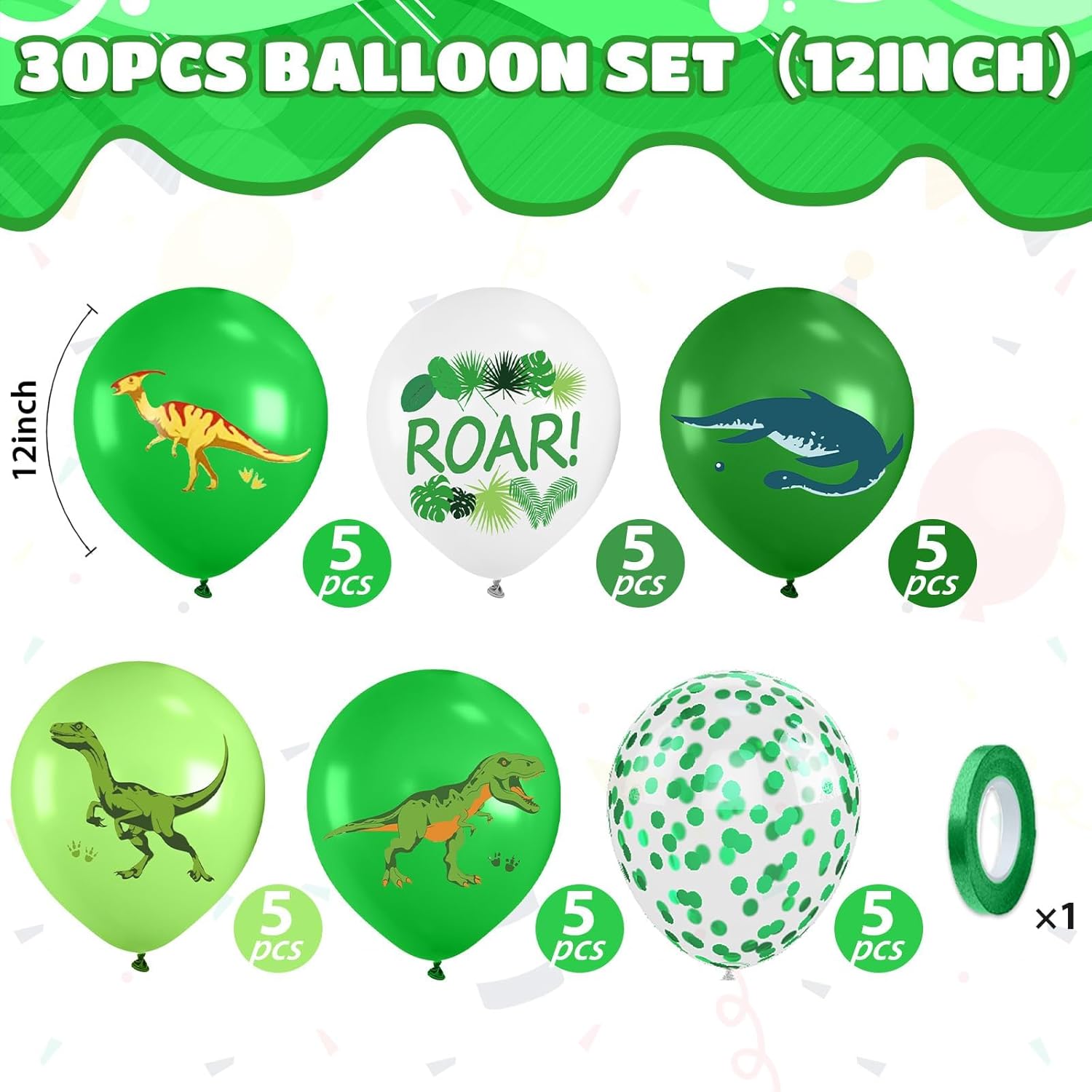 • 【Birthday Party Balloons】This dinosaur balloon set includes 30pcs 12-inch balloons: 5pcs light green balloons with dinosaur print, 5pcs white balloons with dinosaur text, 5pcs dark green balloons with dinosaur illustration, 5pcs fruit green balloons with dinosaur design, 5pcs light green dinosaur balloons, 5pcs green confetti balloons, and 1 green ribbon (10 meters). Great for dinosaur party decorations, jungle-themed events, or any celebration for boys or dinosaur-loving
