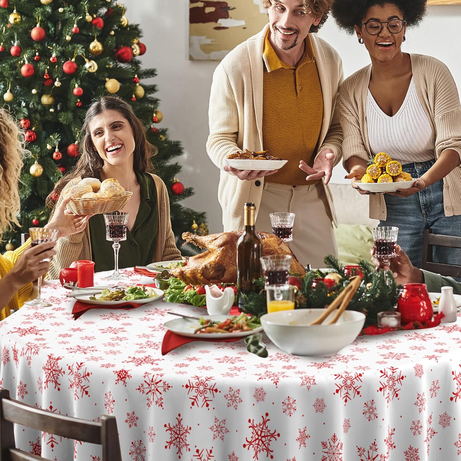 - Extra large size: these red white snowflake Christmas party tablecloth measures approx. 84inches, which fits for various-sized tables that can accommodate 8-10 people,Itโs large enough for your to hold a winter holiday and Christmas theme party with your family and friends to share happiness