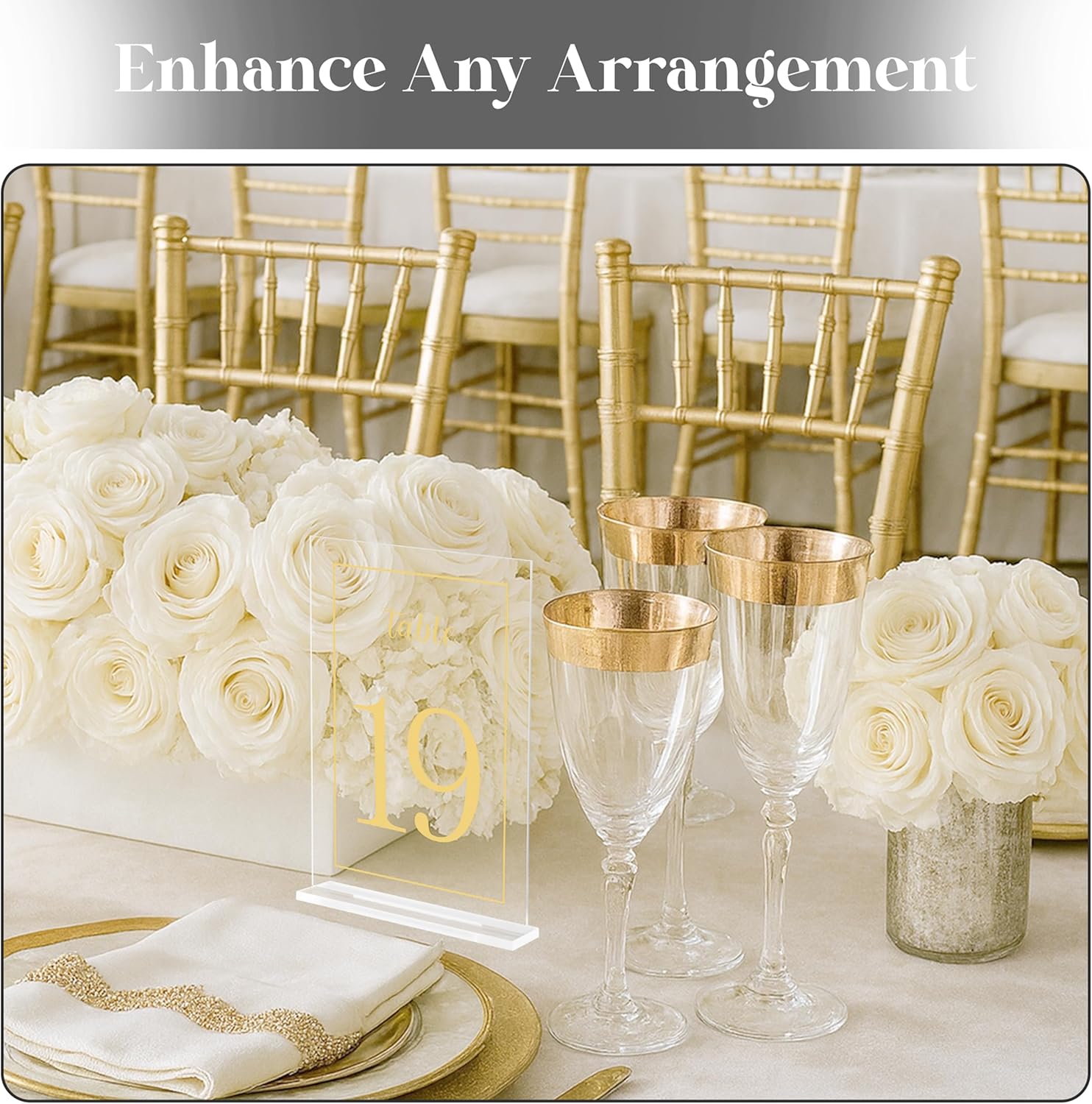 - [PREMIUM MATERIAL] These exquisite table numbers are beautifully designed in stunning shape with printed calligraphy and premium quality clear acrylic material. The slim and stable base offer superior stability. The table numbers and bases are covered with protective film to prevent scratching.