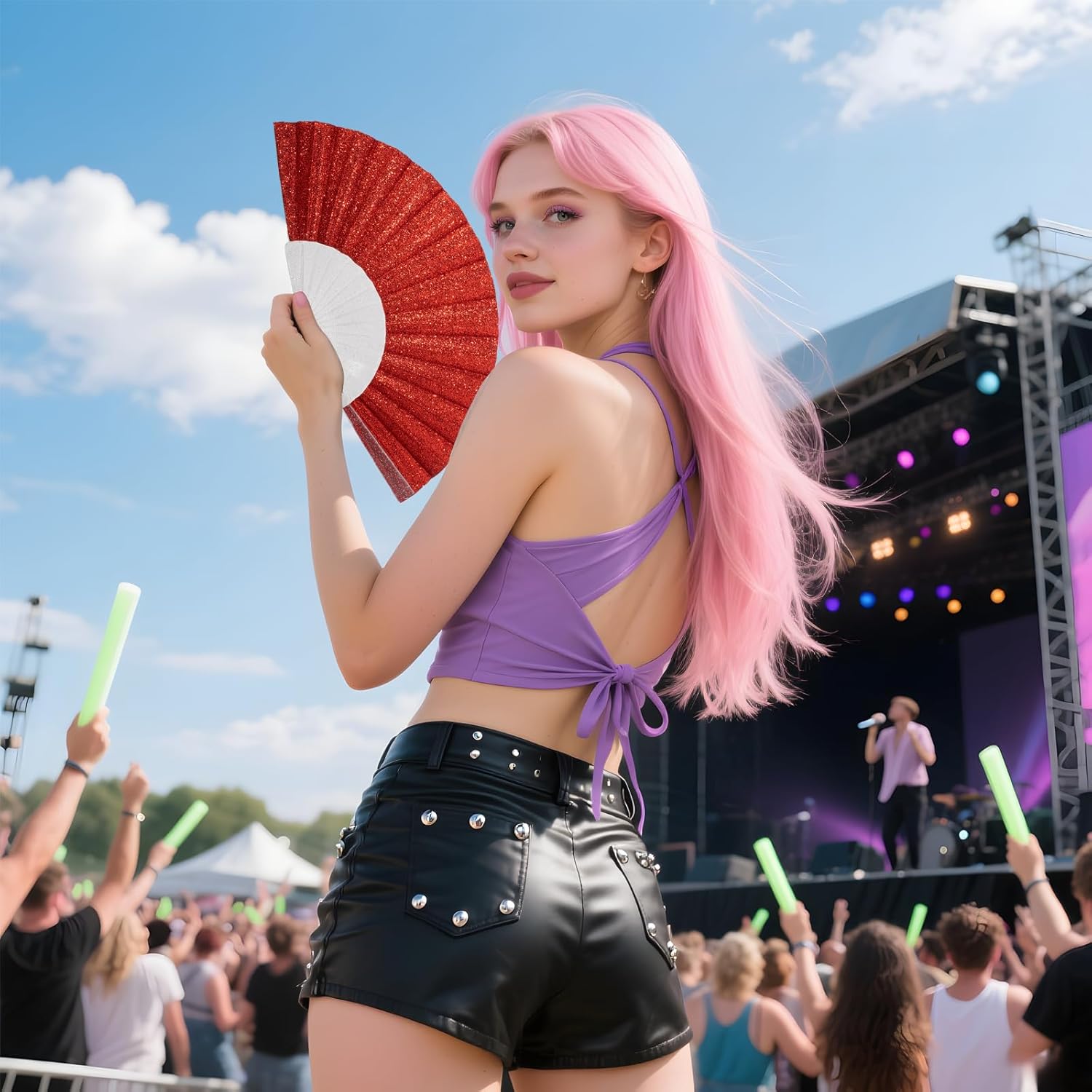 - Glitter Flashpoints Fabric & Polyester Fan Rib: Made from premium glitter flashpoints fabric and polyester fan ribs, this handheld fan features a holographic white design that makes it more attractive and elegant. It stands out as an ideal accessory for weddings, themed parties, festivals, and more.
