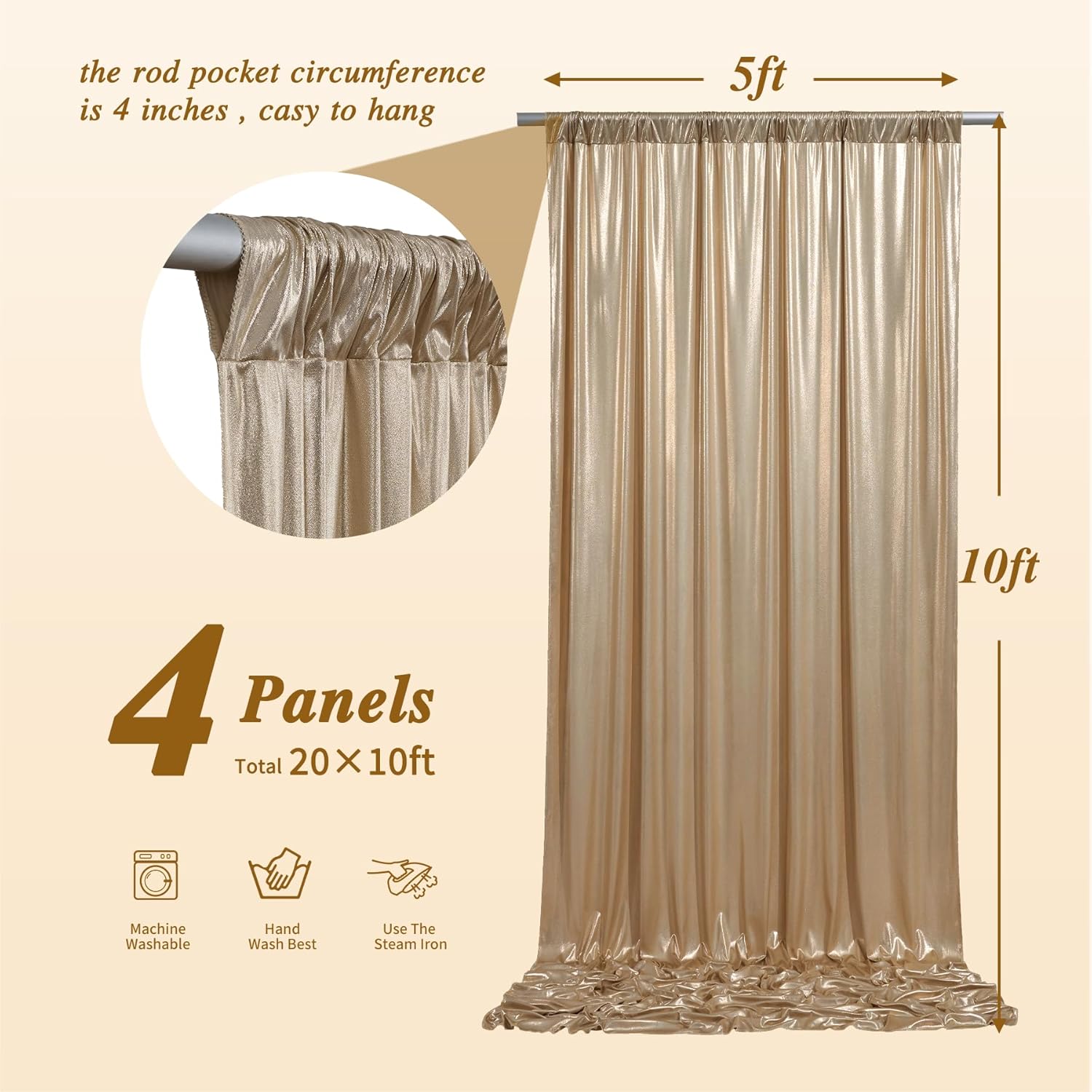 - Sequin Backdrop Curtain: 4 Panels 5FT Width By 10FT Height Sequin Backdrop with a 4-inch rod pocket on the top for easy hanging.