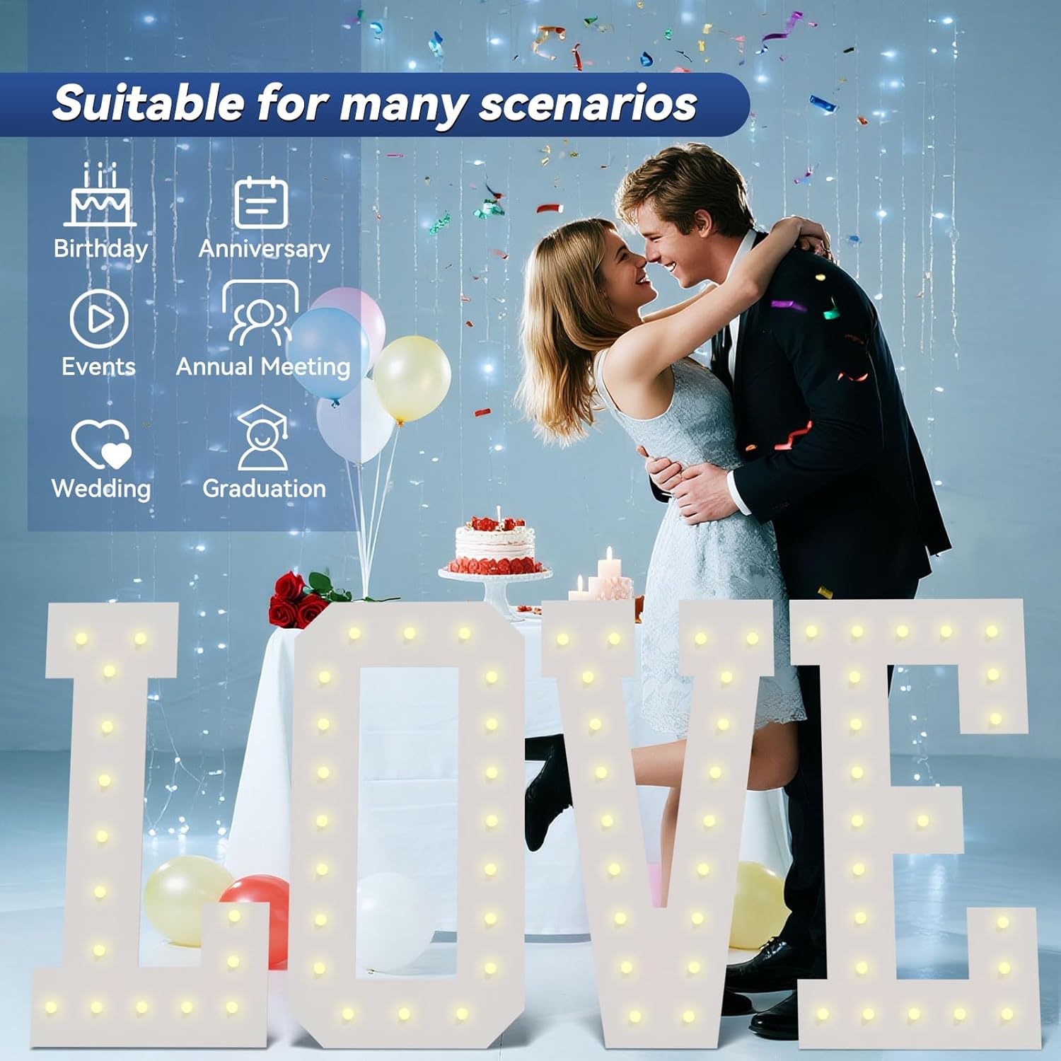- 【Battery Powered Marquee Letters】: Marquee Letters sign designed with warm white led lights, powered by 3 AA batteries(not included) is an eye catching centerpiece for Birthday Party, Wedding, Gender Reveal Party, Proposal, Grad Party, Engagement party and any event etc