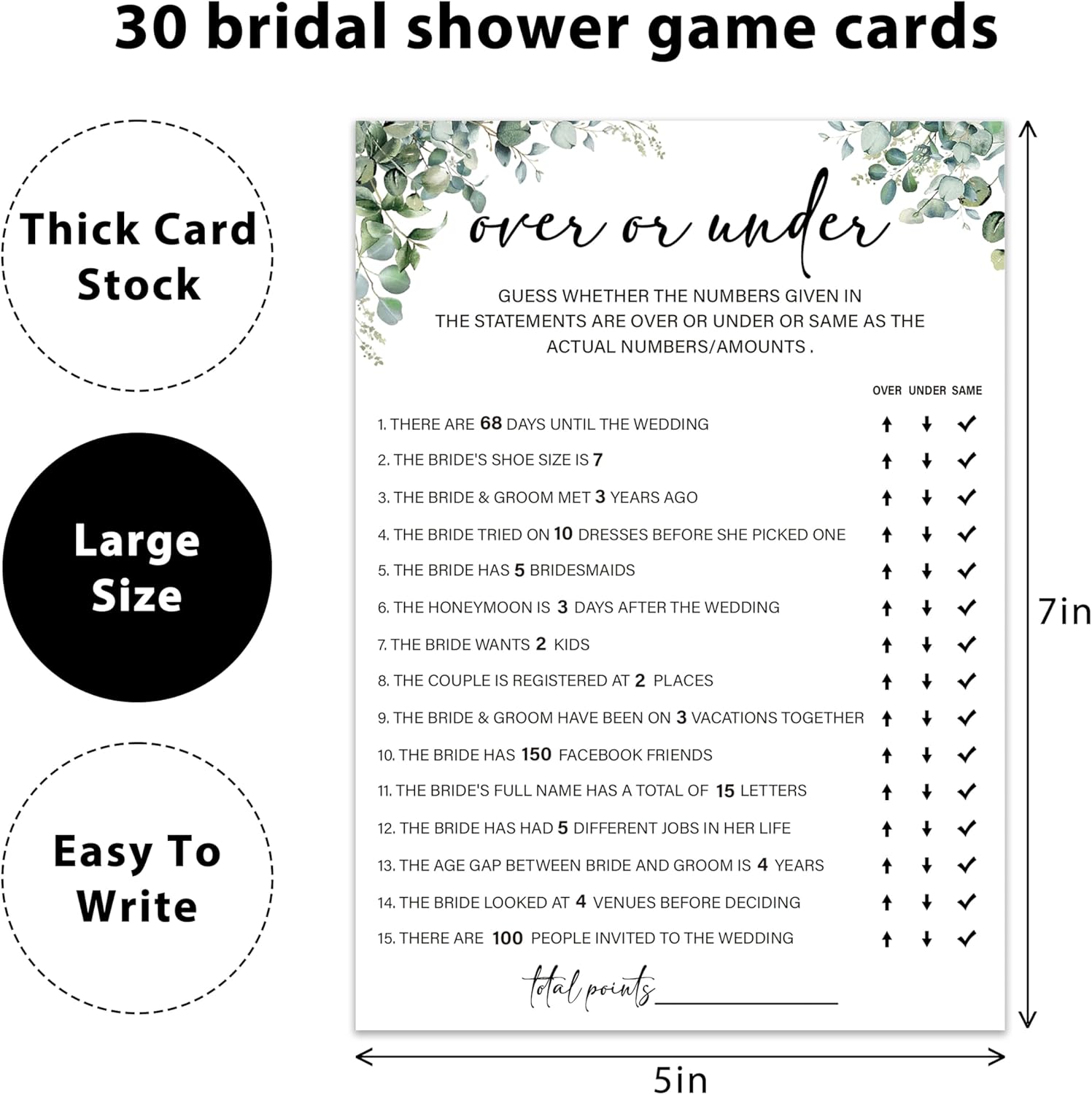 Eucalyptus Bridal Shower Game Cards - Over or Under, Wedding Engagement Bachelorette Party Bridal Shower Games for 30 Guests, Double Sided Cards Set of 30, Activity Supplies & Favor/A02