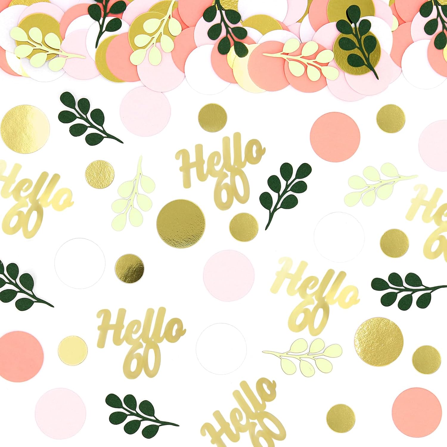 - 3.Charming Colors.The hello sixty birthday table confetti combined 6 colors(shiny gold foil paper/blush pink/peach pink/white/light green/dark green) ,the vibrant colors make the birthday table decor warm and full of vigor.