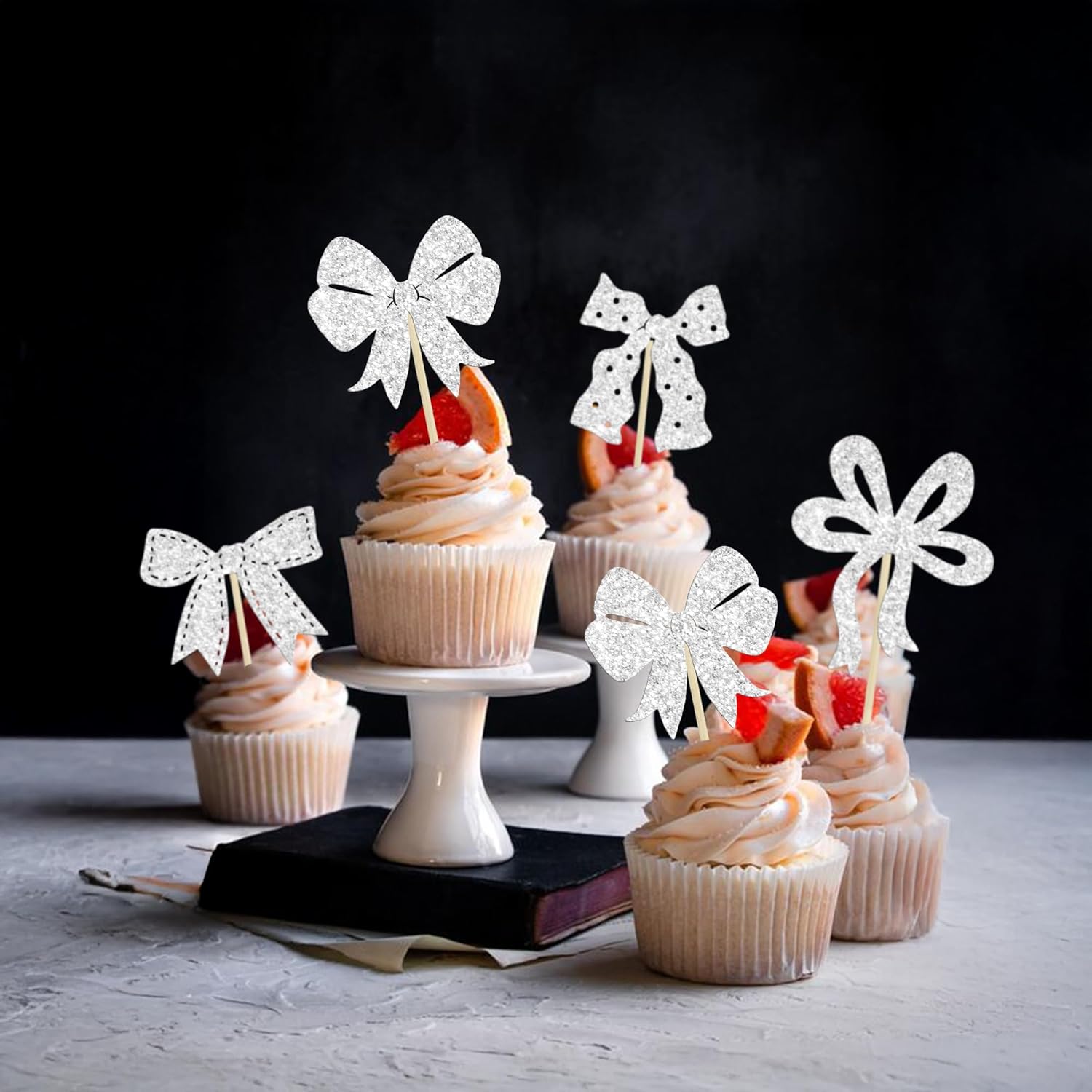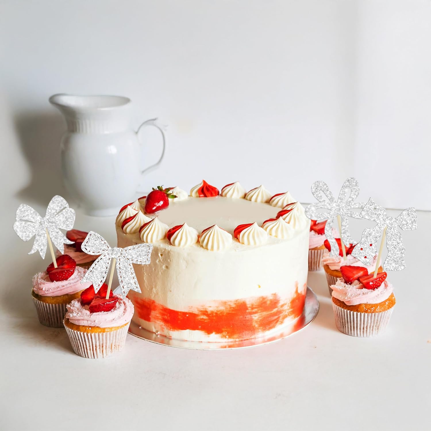 Ephlyn 24pcs Silver Bow Cupcake Toppers for Birthday, Baby Shower, Bridal Shower, Wedding, Bachelorette Party