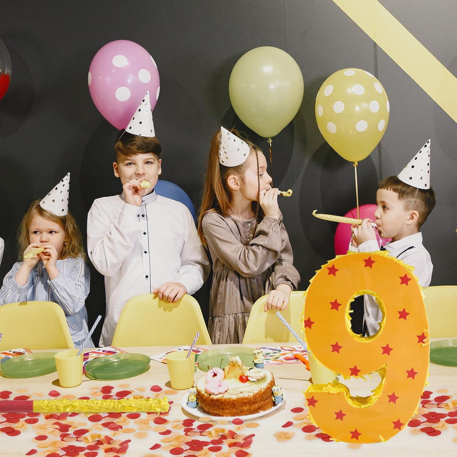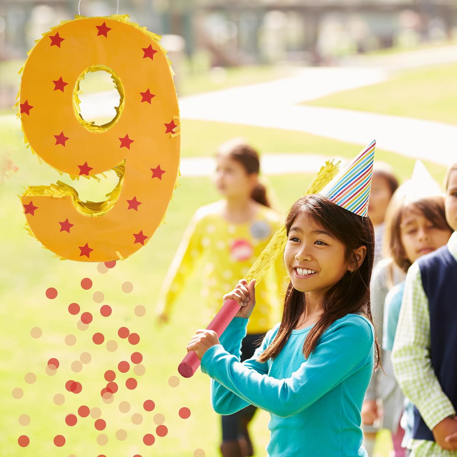 - Package Includes: This set includes a orange and red star number 9 Pinata, 30g confetti,a stick, a blindfold.It is very suitable for creating a cheerful party atmosphere for birthday party.
