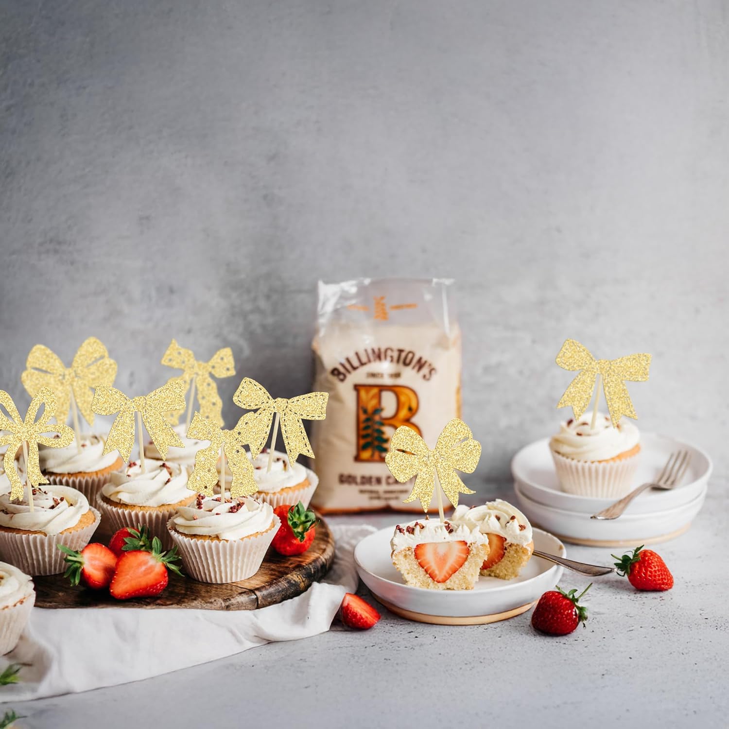 Ephlyn 24Pcs Bow Cupcake Toppers Bow Birthday Cake Topper Girls Birthday Party Decorations Bowknot Cupcake Decorations for Bridal Baby Shower Birthday Wedding Themed Party Gold