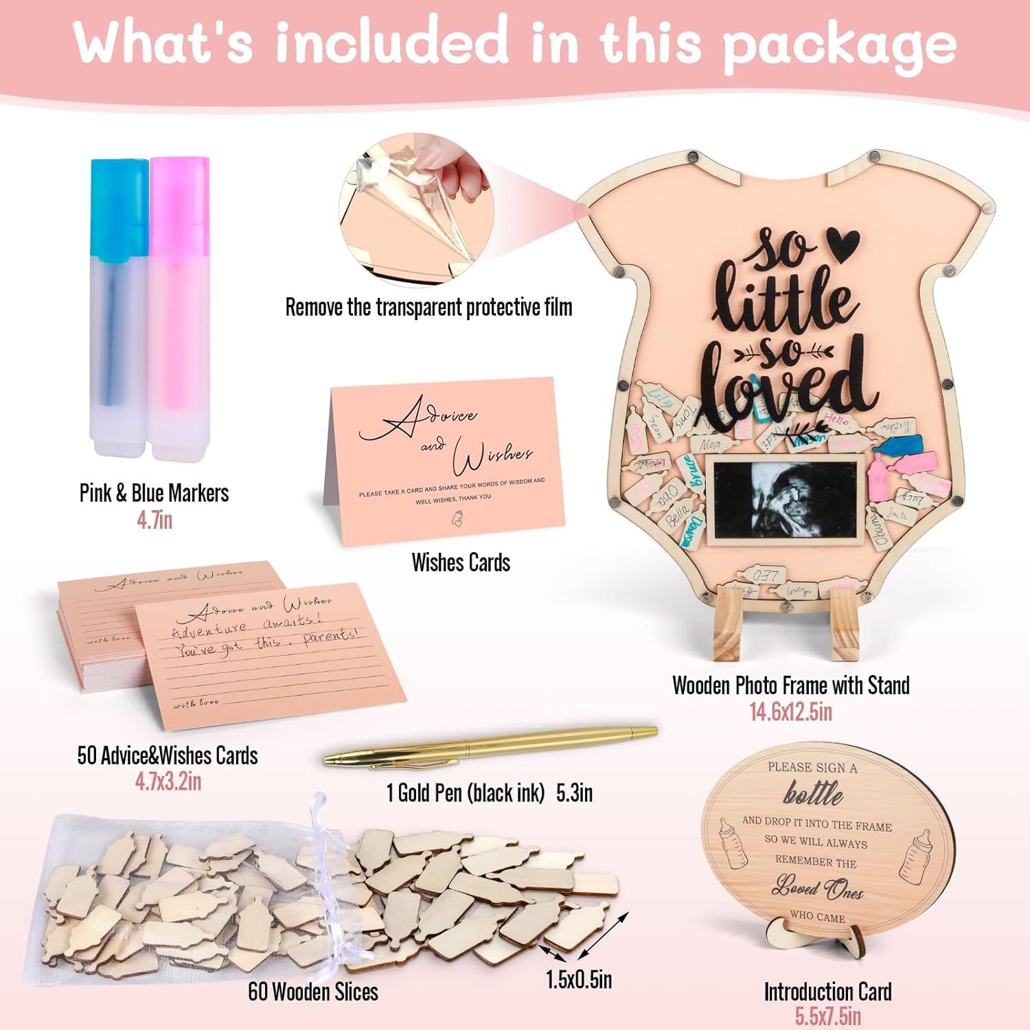 - 🌟 All-in-One Baby Shower Guest Book Set:Includes a wooden onesie-shaped frame with stand, 60 wooden bottle-shaped slices, 1 introduction card, 50 advice cards, 1 gold pen (black ink), drawstring cotton bags, and pink & blue markers — everything you need to create a memorable baby shower experience.