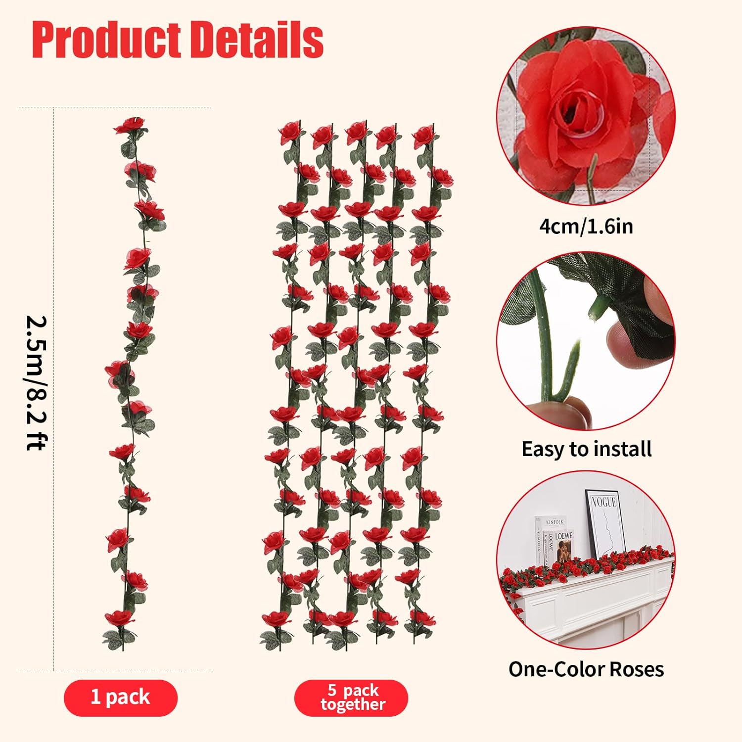 - PACKAGING: Total length 41FT, each vine 8.2FT (250CM), 5 vine plants hanging fake flower garland. Each plant has 45 flowers. Rose heads are 1.6” (4CM) in diameter. 45 leaves. These 5 rose vines are fluffy enough to decorate your room!