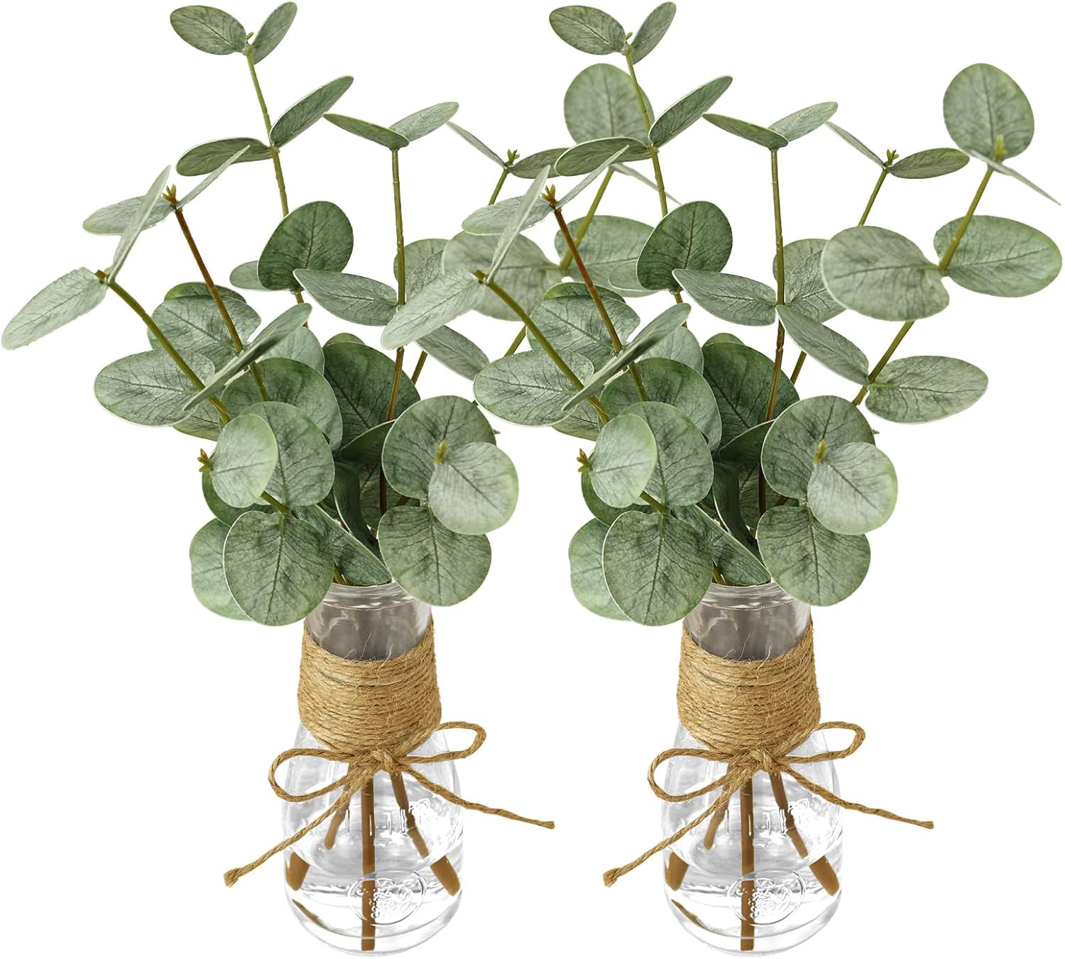 2 Pack Artificial Eucalyptus Stems in Glass Vase Decorative Greenery Artificial Plant with Double Sided Green Eucalyptus Leaves for Home Office Decor (Green-2Pcs)