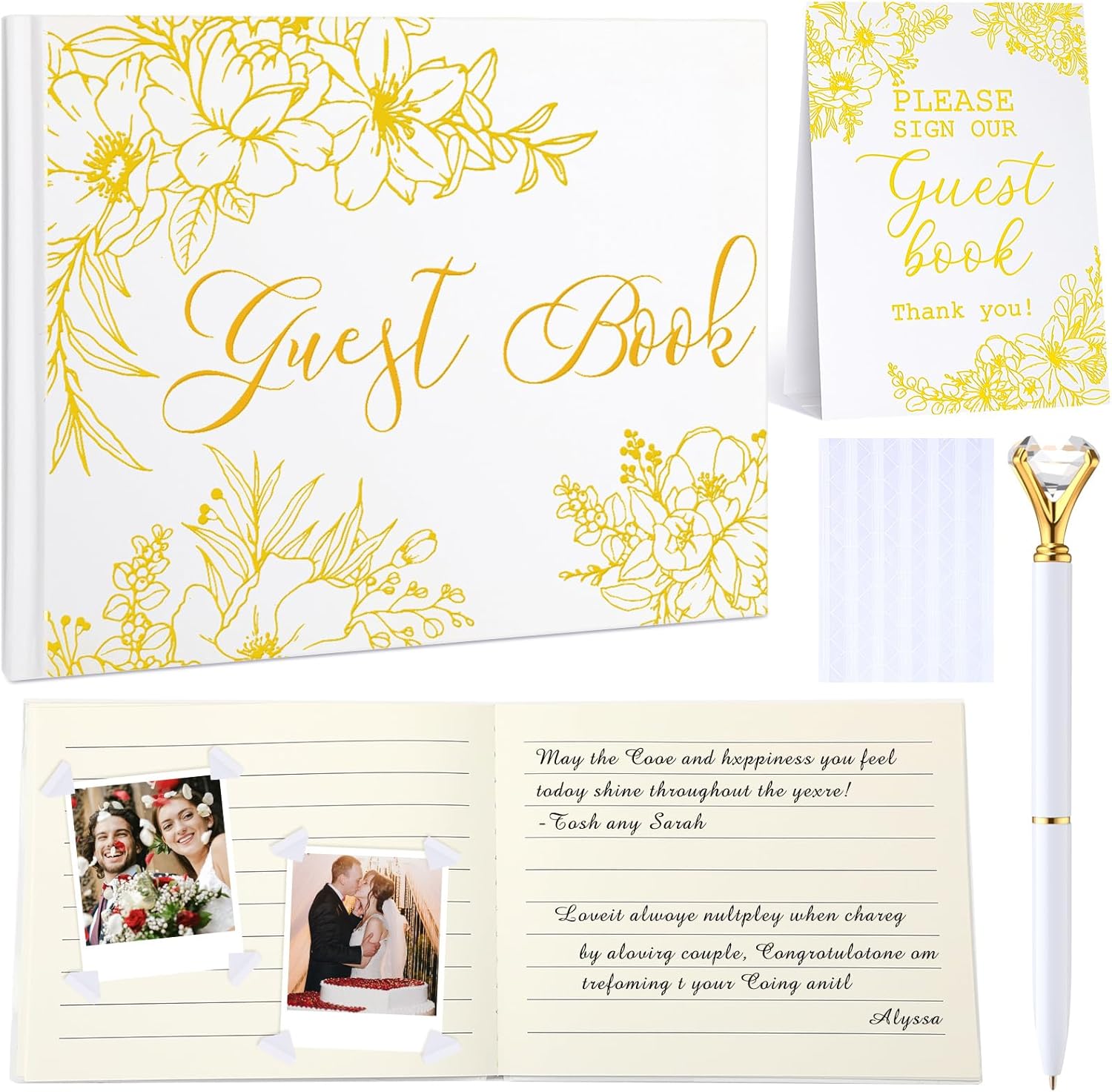 - Complete Set for Party: you will receive a 7x9 inch wedding guestbook, a wedding table sign, a sparkling diamond pen, and 4 sheets of photo stickers; This set provides most things you need to capture snapshots and sincere notes, making your celebration seamless and unforgettable