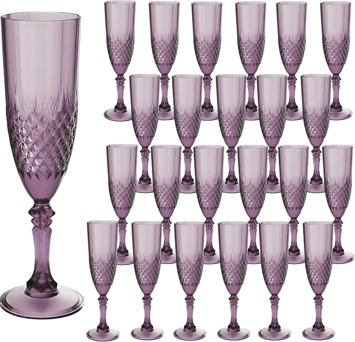 - Charming Set: Champagne flutes set include 24 retro-style dark purple champagne plastic wine glasses, providing ample quantity to meet your daily use and replacement needs. A suitable champagne cup is the icing on the cake. Plastic wine glasses not only carry the wine, but also carries the laughter and blessings